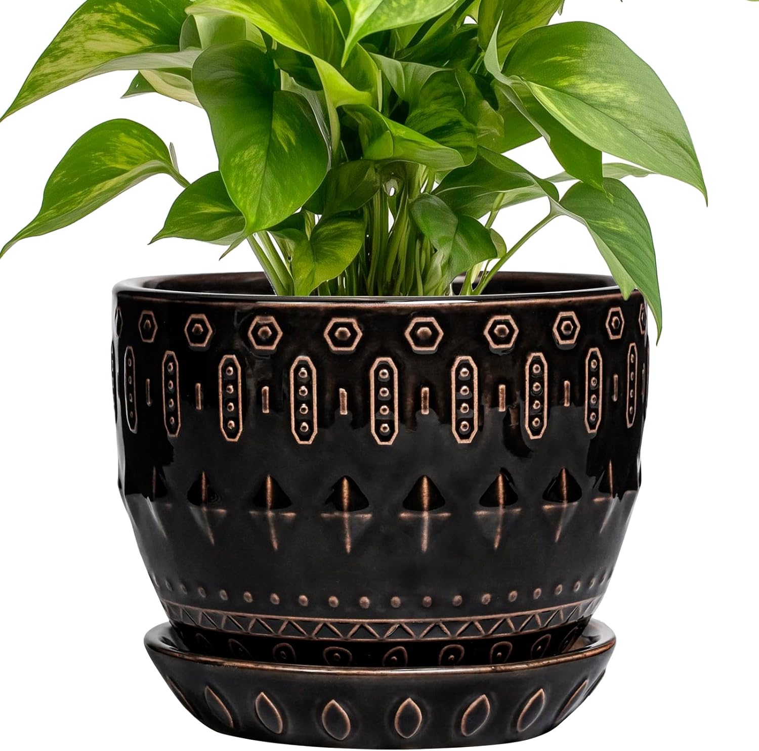 G EPGardening Ceramic Pot for Plants 5.5 Inch - Ceramic Plant Pot Indoor with Drainage Hole and Saucer, Round Boho Planter for Indoor Plants Outdoor, Housewarming Gifts, Garden Office Decor, Black
