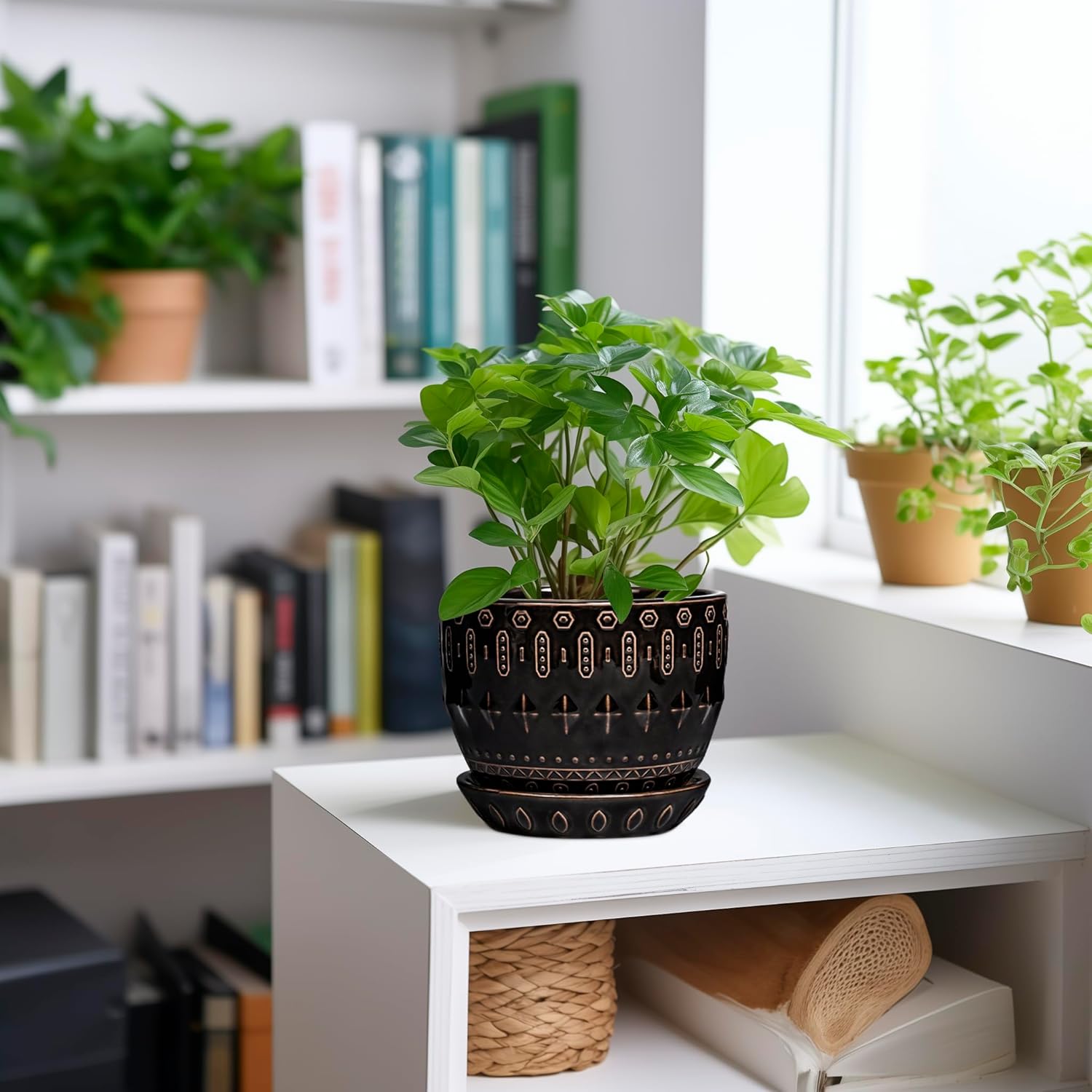 - Draining Hole and Saucer: This 5 inch plant pot comes with a plastic mesh and ceramic tray, which help drain excess water, retain soil, and keep your table tidy