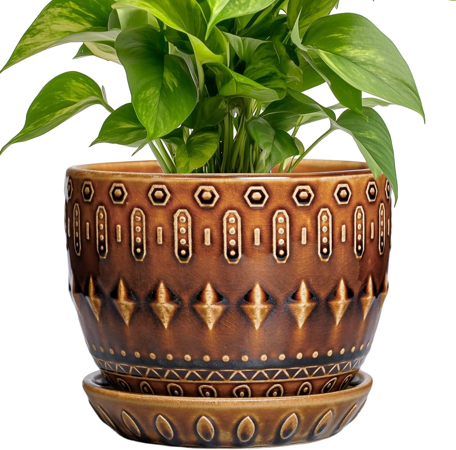 G EPGardening 5.5 Inch Plant Pot - Ceramic Planter for Indoor Outdoor Plants, Boho Round Indoor Flower Pot with Drainage Hole and Saucer, Housewarming Gifts, Garden Home Room Decor, Brown