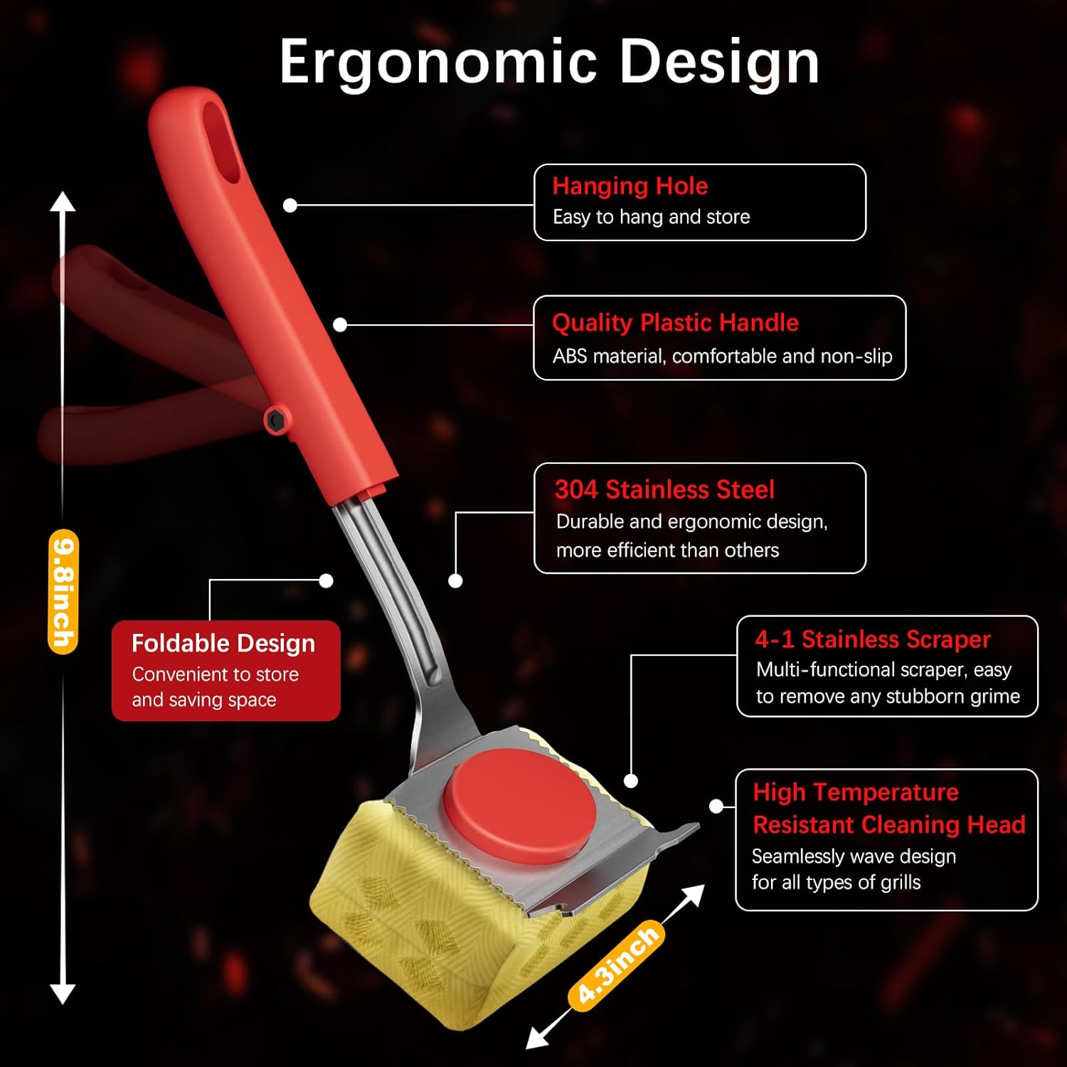 - ใ๐๐ง๐๐ฎ๐ฌ๐ญ๐ซ๐ข๐๐ฅ-๐๐ซ๐๐๐ ๐๐ฎ๐ซ๐๐๐ข๐ฅ๐ข๐ญ๐ฒใ Military-spec components: anti-rust stainless steel withstands 1600ยฐF direct flame contact. High temperature resistant textured ribbed sponge head - lasts more than3 grilling seasons (Lab tested: 500+ clean cycles). Tough plastic handle protects your hands from burning. Come with an extra dishwasher safe sponge replacement, easy to assemble and straight forward to use.