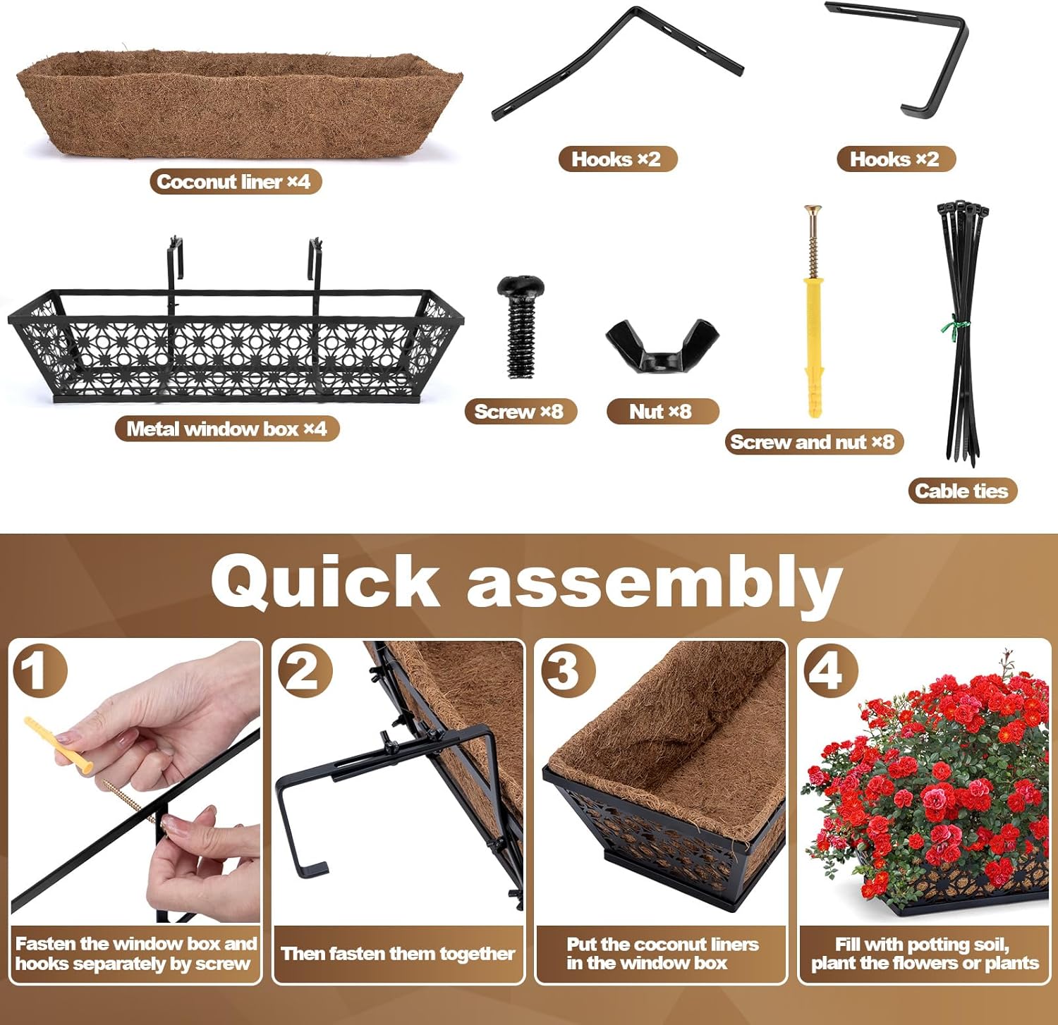 4 Pack 24 Inch Window Box Planters Outdoor,Deck Railing Planter Boxes with Coco Liner,Metal Hanging Window Flower Boxes for Balcony Fence Porch Garden Railing – Outdoor Window Flower Box