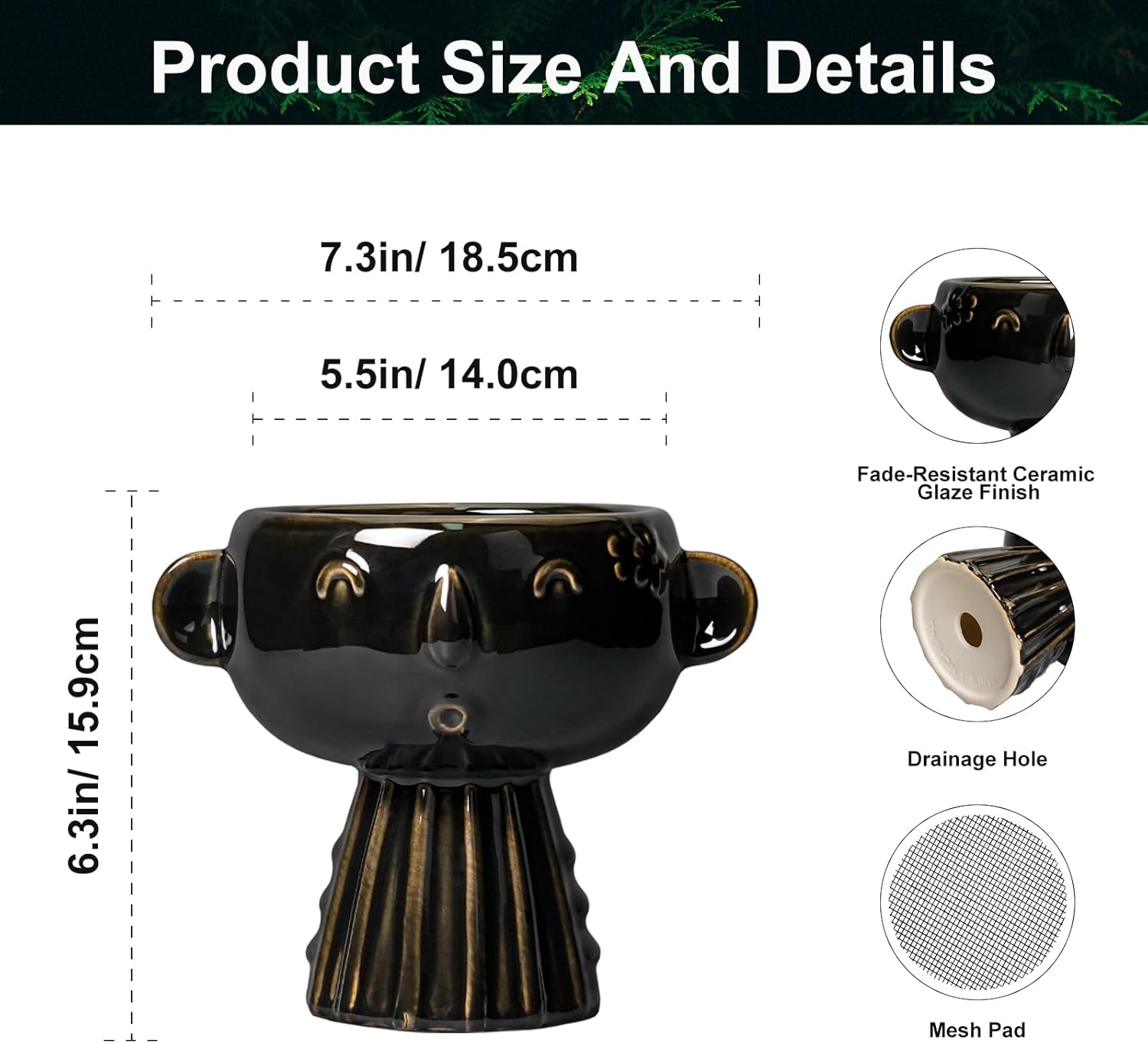 Head Planter 7 Inch - Ceramic Face Planters with Drainage Hole, Funny Succulent Pots for Indoor Outdoor, Cute Decorative Plant Pot, Desk Office Room Home Decor, Black