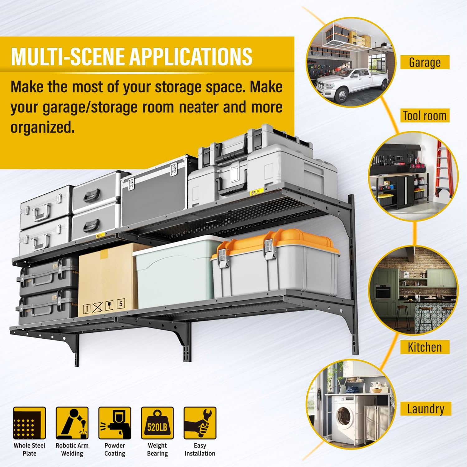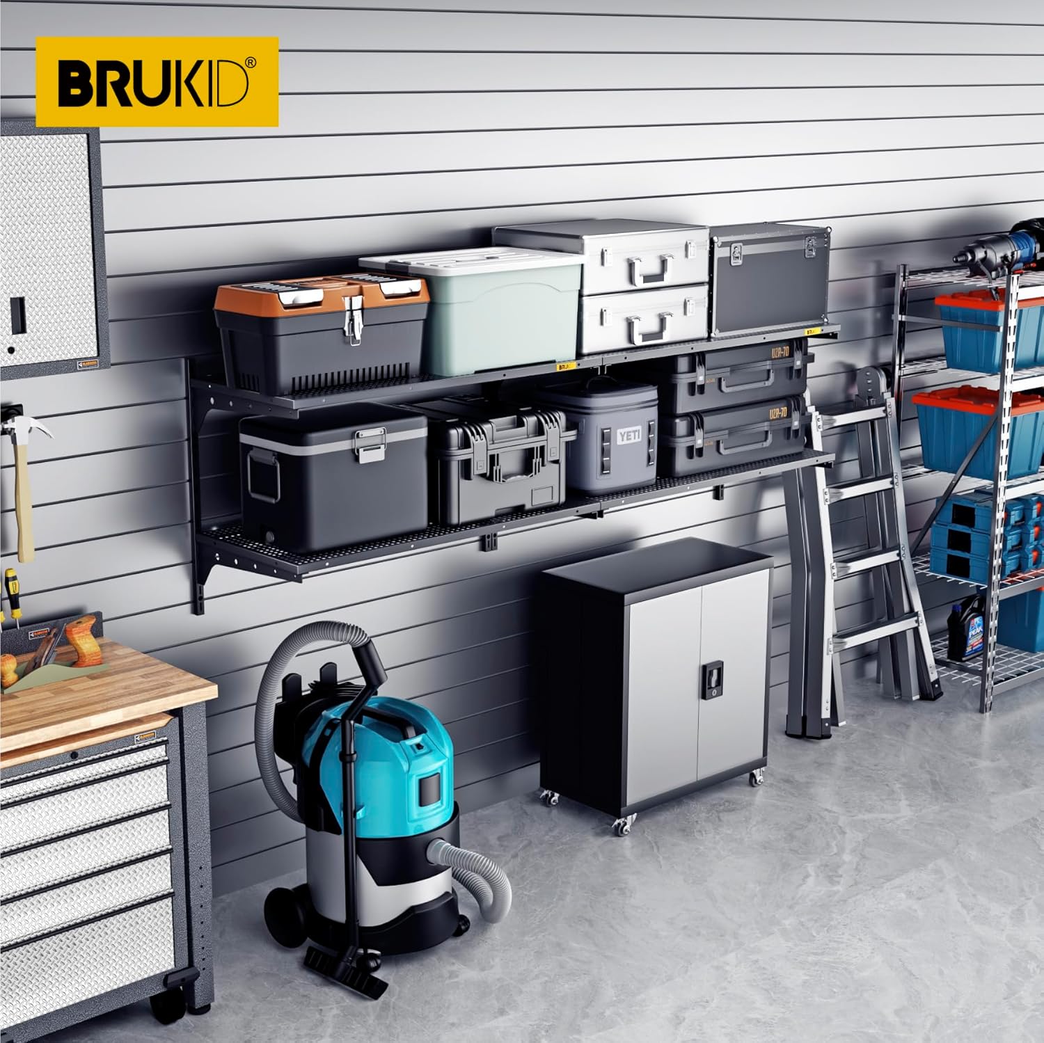 - 520lb Load Tested: Each panel of our Brukid heavy-duty wall shelf has undergone rigorous testing, with a 130-lb weight capacity per panel. This 2-pack of 2-tier (1.3x3ft) units offers a combined total capacity of 520 lbs, making it ideal for heavy-duty storage in garages, workshops, or commercial spaces.