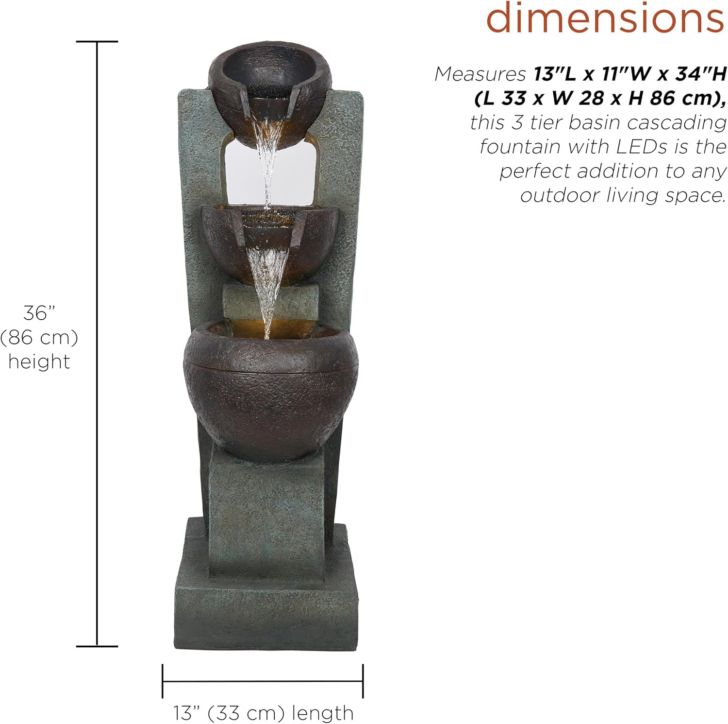 - 34" 3 TIER BASIN CASCADING FOUNTAIN – This elegant 3-tier basin design creates a peaceful cascade of water, flowing gracefully from one level to the next, adding tranquility and charm to your garden, patio, yard, or any outdoor space for an inviting atmosphere.