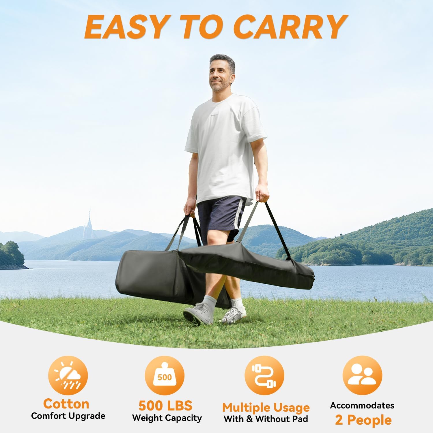 - 【Removable Quilted Polyester Pad】: The double hammock made of Two-layer quilted polyester fabric, filled with polyester fibers inside. and also features a polyethylene-filled headrest for excellent comfort. The reinforced ties can secure the pad in place.It can be removed for easy cleaning, and it won't fade even after long-term use. It is perfect for camping and outdoor activities.