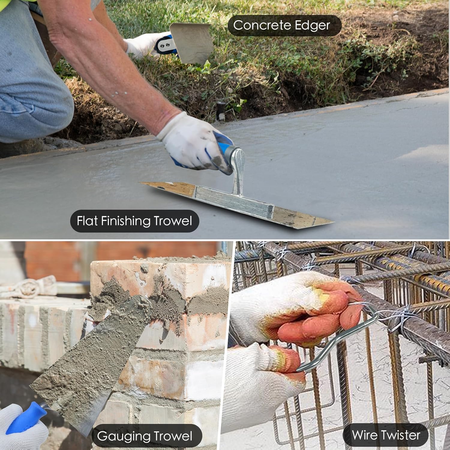 - 【10-Piece Contractor-Grade Concrete & Masonry Tool Kit】Includes wood float, flat finishing trowel, pool trowel, gauging trowel, margin trowel, edger, groover, wire twister, anti-slip gloves, and a heavy-duty carry bag. From rough surface prep to detailed edgework and rebar tying, this concrete trowel set meets the demands of both contractors and serious DIYers