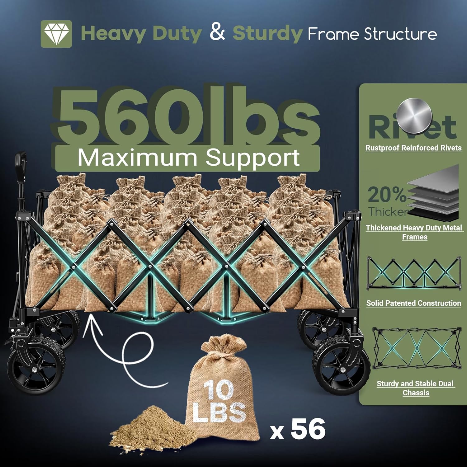 300L Extra Large Wagons Carts Foldable, 560LBS Heavy Duty Collapsible Beach Wagon 48" Long with Big All-Terrain Wheels, Utility Folding Cart for Camping, Grocery, Sports, Garden, Green