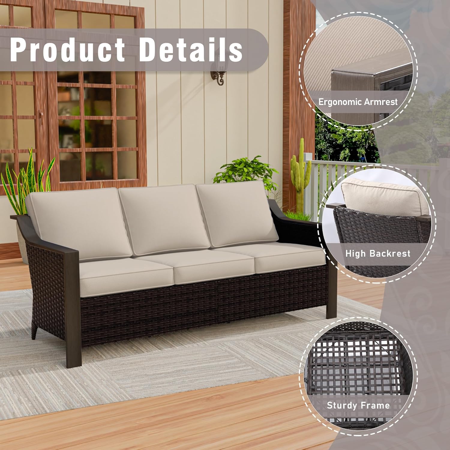 74 Inch Patio 3-Seater Sofa,PE Wicker Outdoor Lounge with Thick Removable Water-Resistant Cushions, Rust-Proof Steel Frame, 900LBS Capacity, Beige