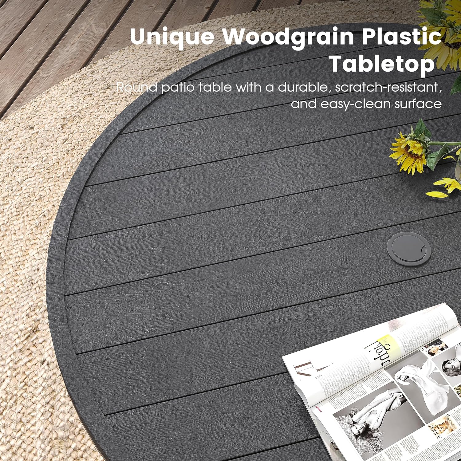 DIFY Round Outdoor Patio Dining Table for 8, 56.3" Patio Table with All-Weather Faux Wood Tabletop and Metal Steel Frame, Outside Table for Garden Porch Backyard, Black Tabletop