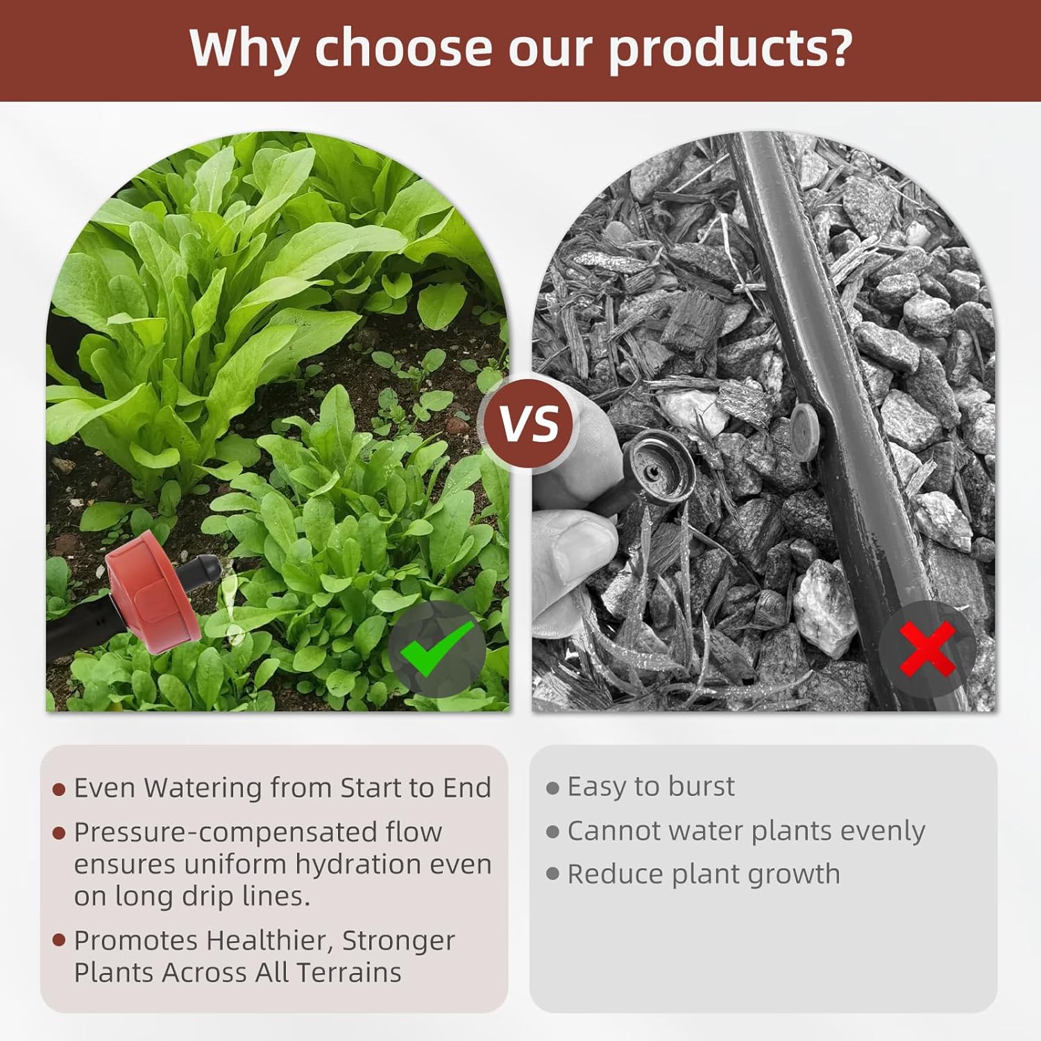- Pressure Compensating Technology: Our pressure compensating irrigation spot drippers/emitters maintain a constant, steady 1 Gallon Per Hour(4L/H) water flow at 10-60 PSI. Whether on slopes, long lines, or uneven terrain, your plants will get the precise amount of water they need without the hassle of over- or under-watering.