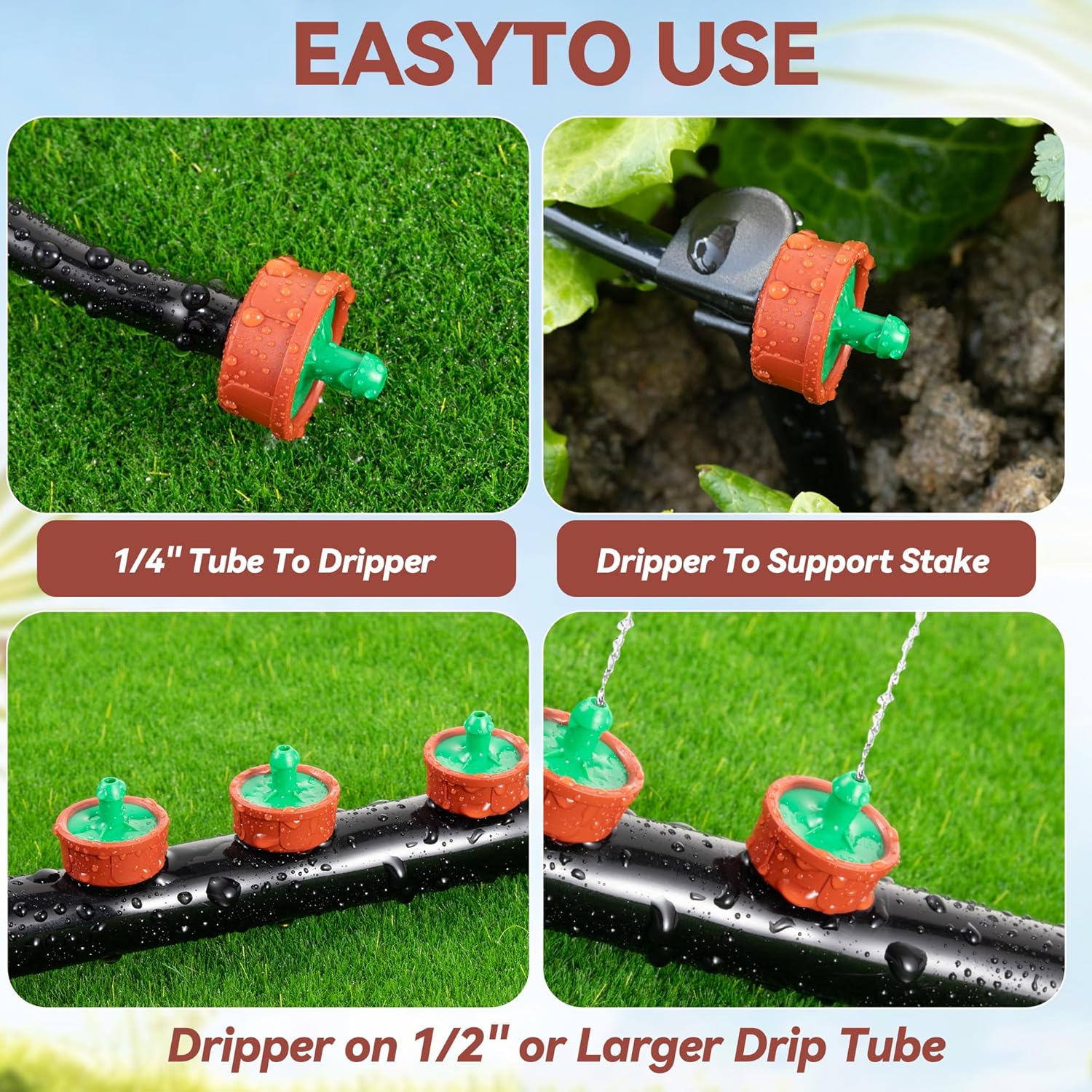 - 【Easy to Use】The irrigation drip emitters can be directly connected to1/4 inch drip irrigation tubing or inserted into a 1/2 inch or larger drip tubing use a1/4 inch hole punch,Its self-flushing system clogging resistance function makes the irrigation emitters ideal for plants, trees, greenhouse, nursery, orchards watering