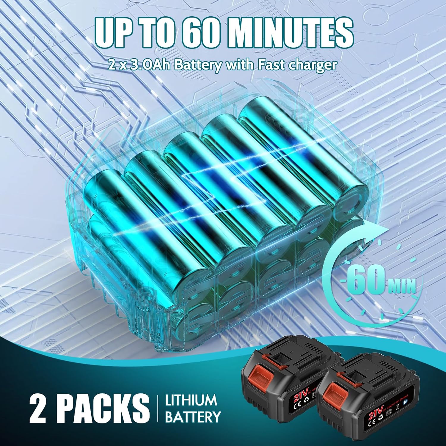 - 【Powerful Battery Performance】Equipped with two 3.0Ah batteries and a fast charger, this string trimmer provides up to 60 minutes of uninterrupted runtime. Perfect for handling large yards with ease, it ensures you have ample power for extended tasks. For safety, avoid charging in rainy or wet conditions.
