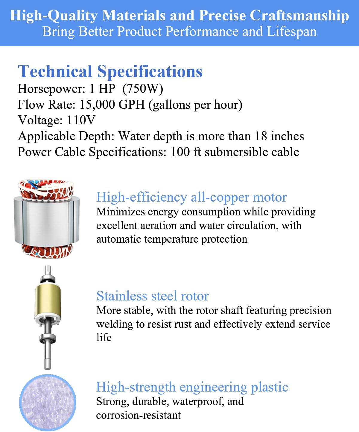 - Energy-Efficient & Easy Installation – Plug-and-play design connects to standard 110V; includes 100-foot waterproof power cord and support cable; operates in water as shallow as 18 inches.