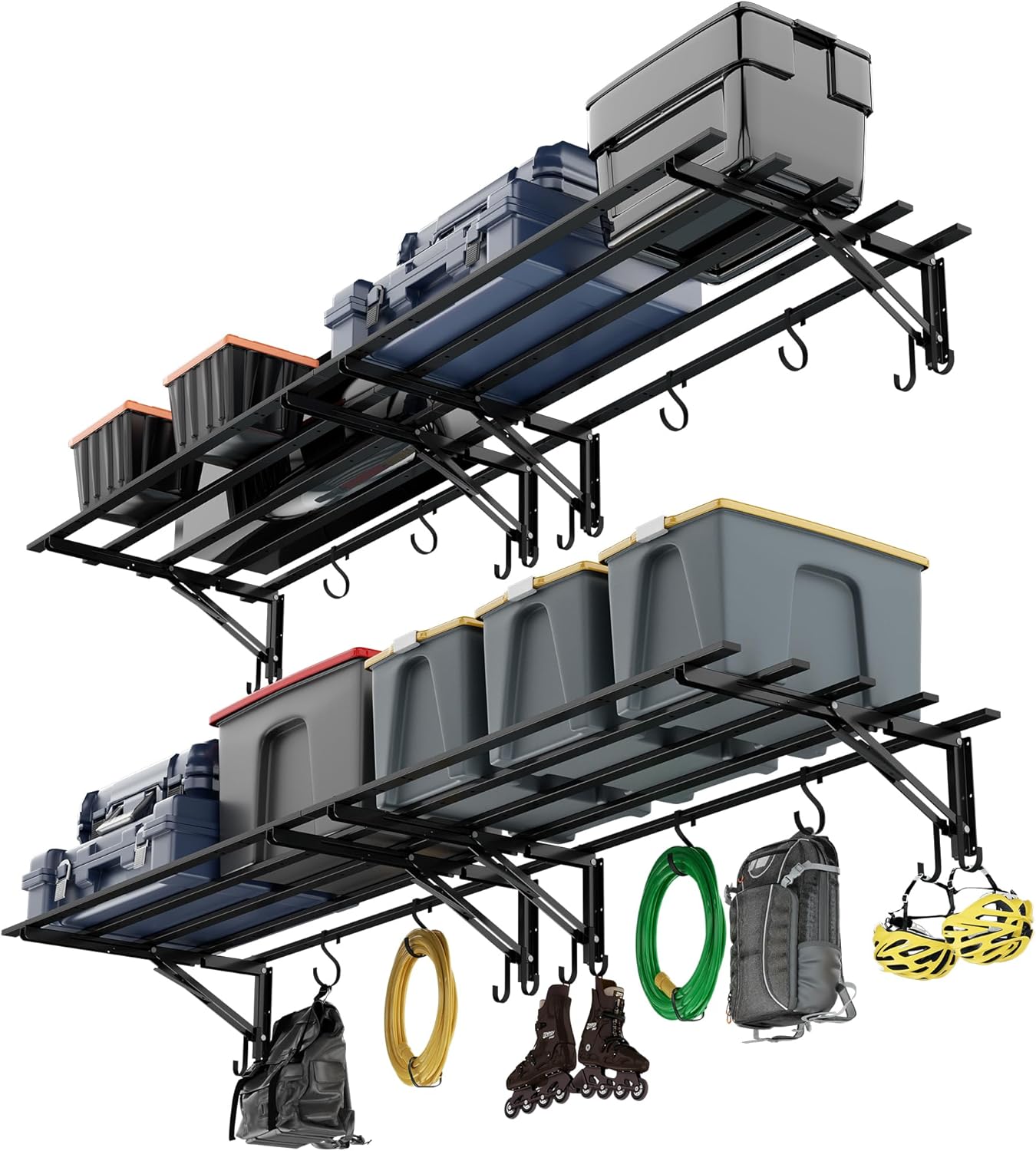 4-Pack Garage Storage System Shelves 3.21x1.64 ft - Compact Folding Wall Shelves for Garage, Sturdy Metal Wall Shelving with Hooks, Versatile Metal Hanging Shelf Design, Sleek Floating Black Shelf