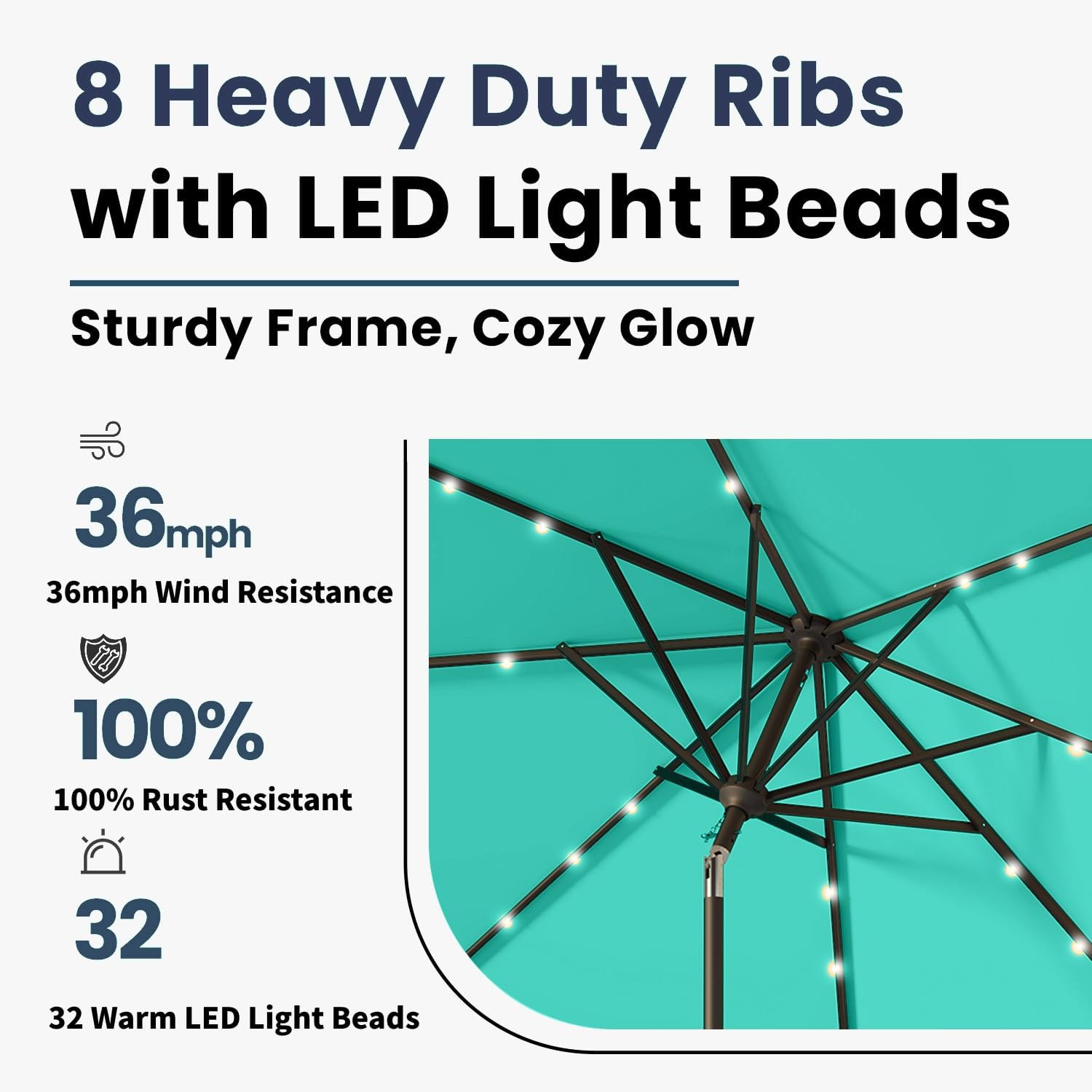 9FT Solar Umbrella 32 LED Lighted Patio Umbrella Table Market Umbrella w/Tilt and Crank, UV-Resistant Outdoor Umbrella for Pool, Garden, Deck, Turquoise Blue