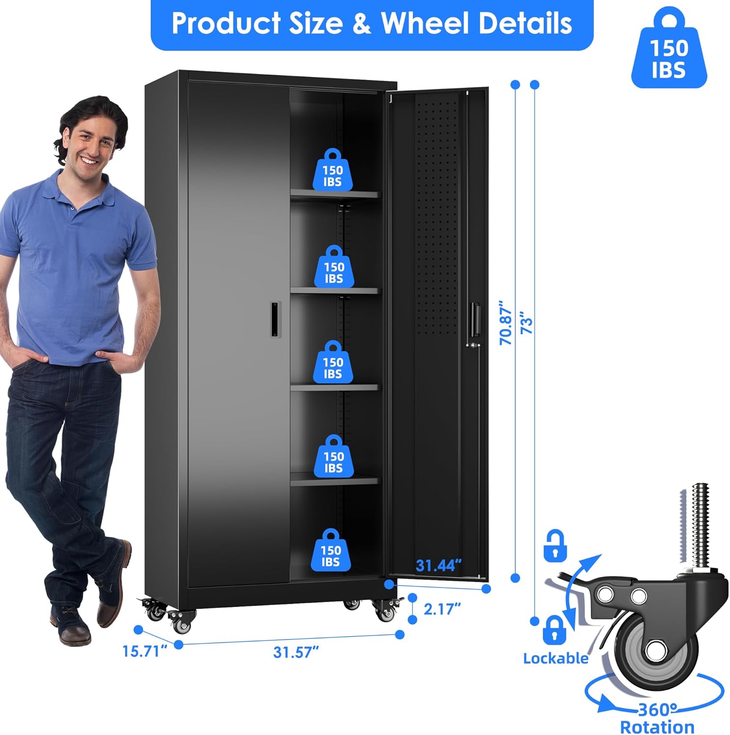 73" H Metal Garage Storage Cabinet with Wheels & Pegboard,Rolling Tool Cabinet with 2 Doors and 4 Shelves for Garage,Home,Office,Warehouse,Workshop, Required-Assembly,Black