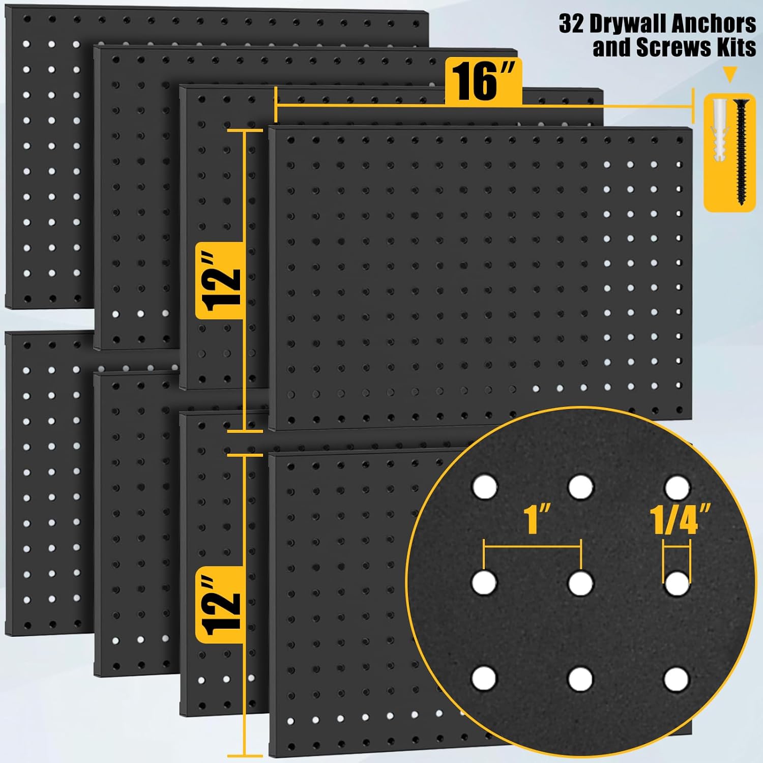- Great for Tools Organization: This garage storage pegboard system can be DIY according to your storage needs. Each 16 x 12 inch pegboard with 1/4 inch holes, 8 pegboards can form a 48 x 32 / 64 x 24 pegboard wall. Suitable for organizing garage tools or garden tools and all kinds of tools. A nice choice for storing and holding your tools in kitchen, garage, utility room, basement or shed