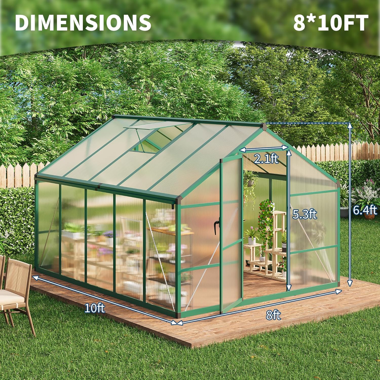8×10 FT Greenhouse, Large Walk in Greenhouses for Outdoors and Garden Planting, Polycarbonate Greenhouse with Enhanced Aluminum Frame, Green Houses with Quick Setup Structure and Roof Vent, Green