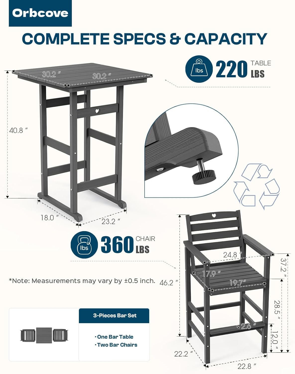 Adirondack Outdoor Bar Table, Durable HDPE Composite, Weather Resistant, Easy to Clean, Perfect for Backyard and Poolside Use, Grey