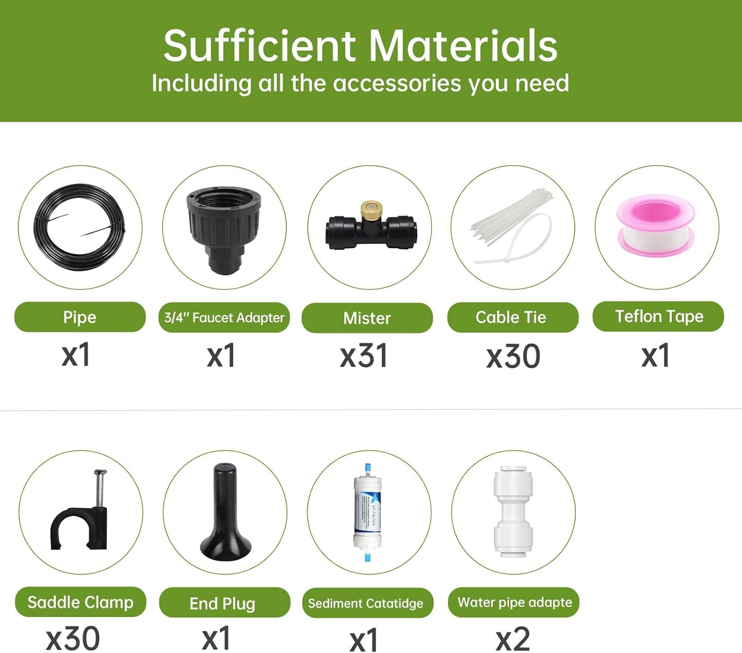 - Eco-Smart & Safe - Low water consumption (70% savings vs. manual watering) and skin-friendly mist distance guidelines. Enjoy guilt-free cooling while protecting your family and plants