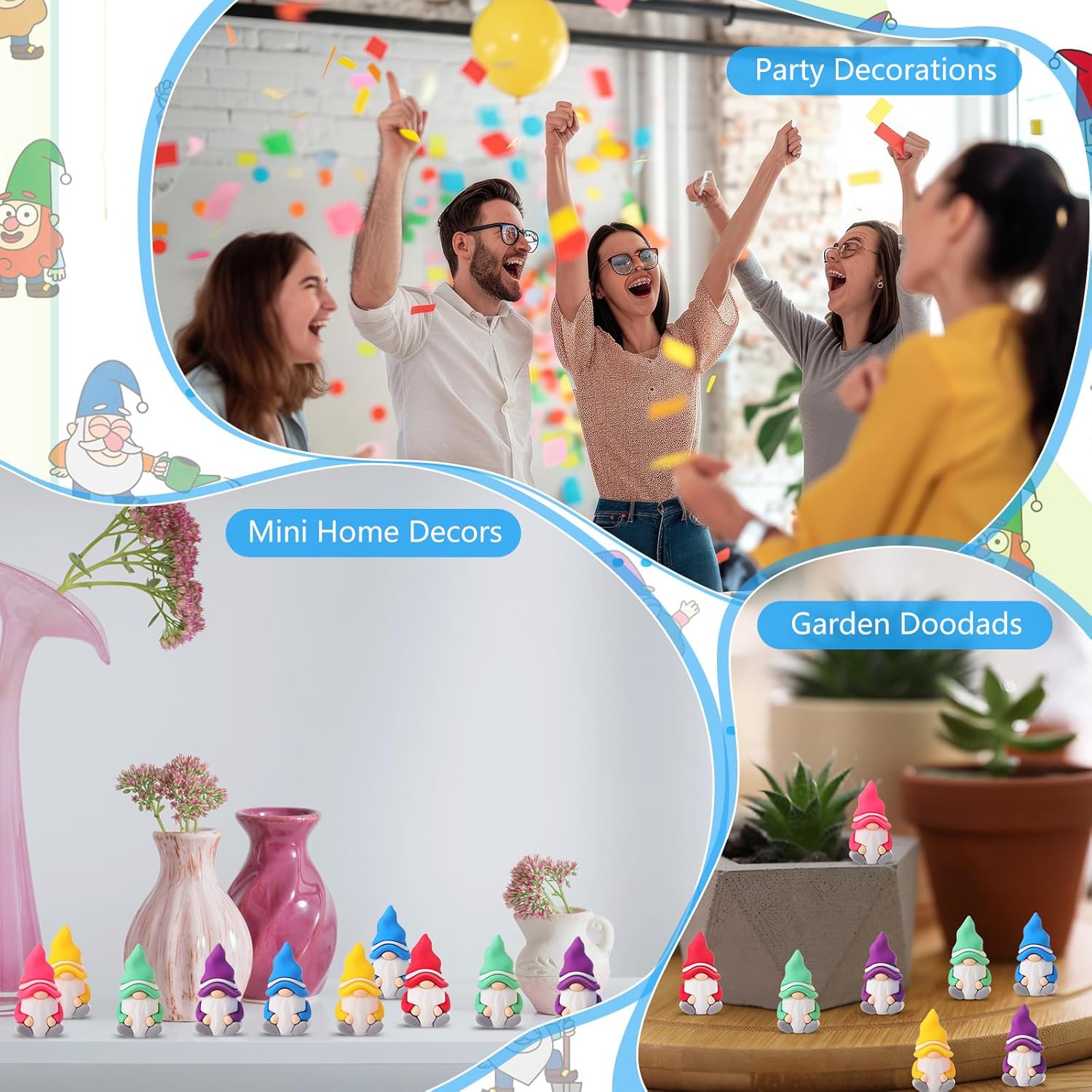 - Delightful Variety in Every Pack: our set of 15 tiny gnomes includes miniature gnome figurines in vibrant colors like red, yellow, green, blue, purple, and rose red; With 2 small gnomes of each color and 3 random colors; You'll have ample options to suit your decorative needs; Whether you're spreading joy at a festival or sprucing up your living space, these mini gnomes figurines offer endless creative possibilities for any occasion