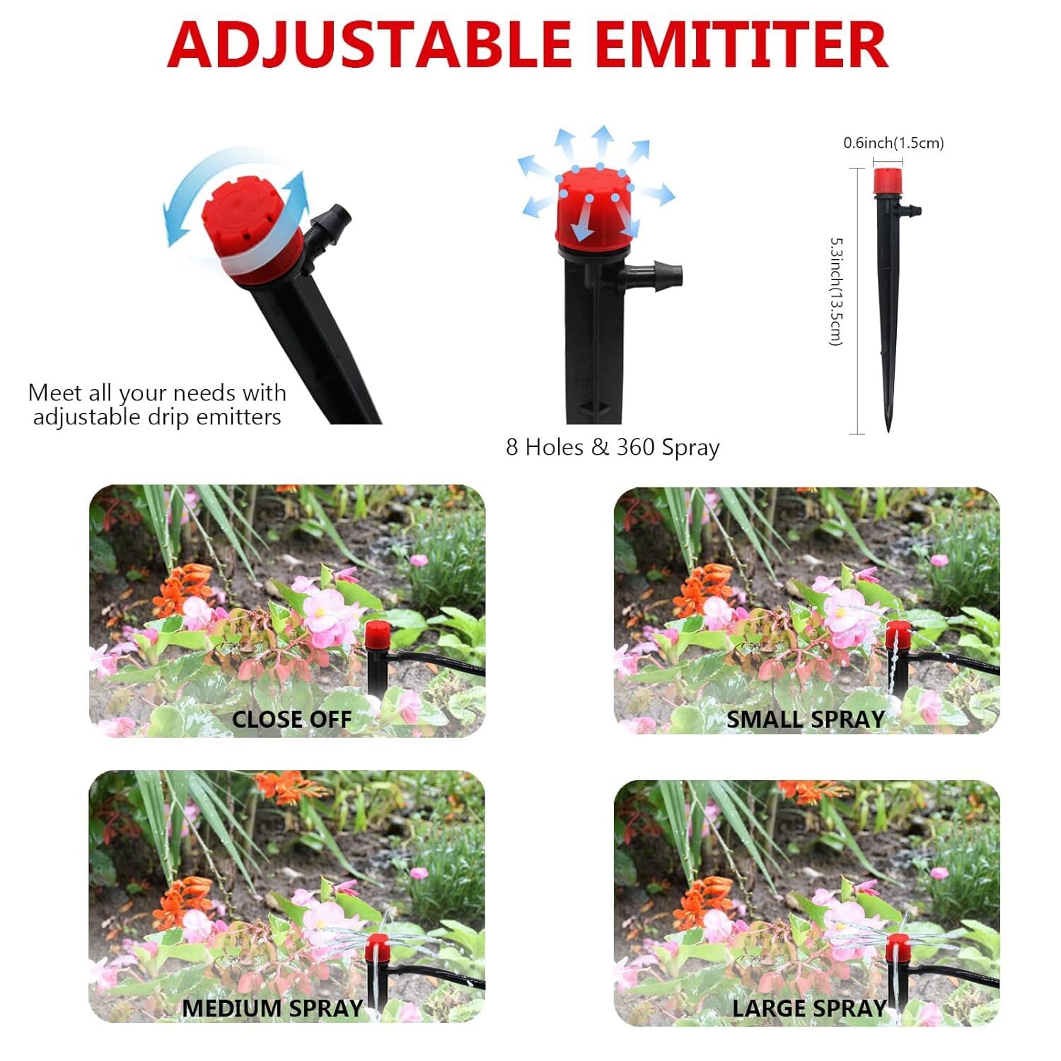 - 2 Kinds of Sprayers and Upgrade Tubing Design: Includes two sprayers (15 drip emitters and 15 vortex emitters ) that can be adjusted for different water flows. The main tubing is upgraded to a 1/2-inch diameter to support high water pressure. The 39.36FT main pipe can be cut in two, and two faucet connectors are included, allowing you to easily set up two drip irrigation systems as needed.