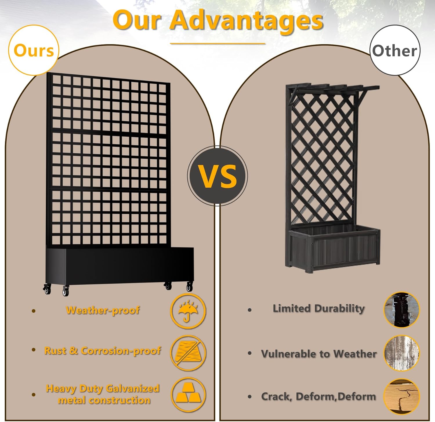 - 【3-in-1 Metal Planter Box with Trellis】This 72.1-inch high Metal Planter Box with Trellis functions as a raised garden bed for flowers, vegetables, or fruits, a strong support for climbing plants, and a stylish privacy screen. Perfect for versatile outdoor planting and decoration.