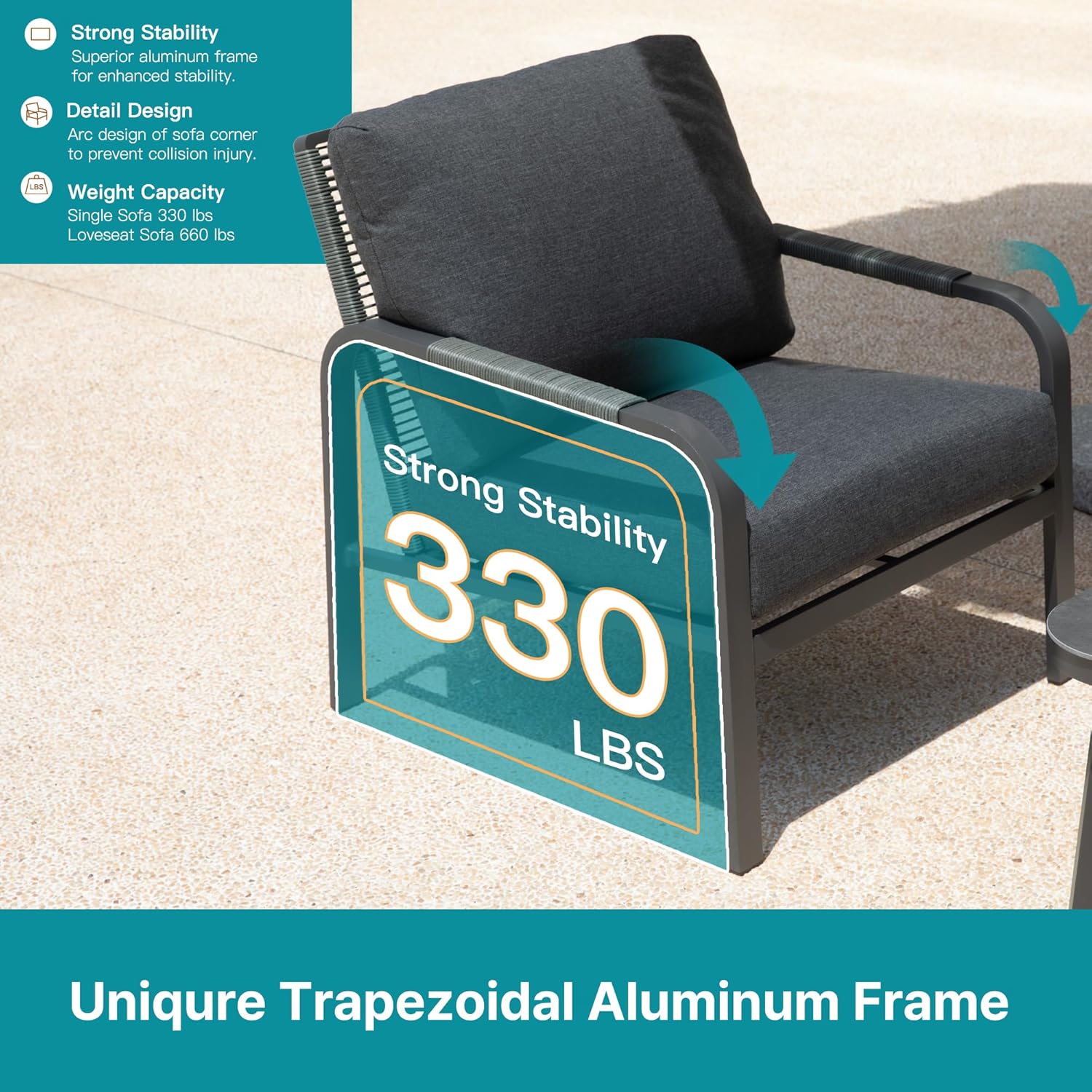 - Premium Durable Materials This patio bistro set features a rust-resistant powder-coated aluminum frame and all-weather PE rattan. It withstands sun, rain, and temperature changes, ensuring year-round durability. Each chair supports 330 lbs, and the coffee table holds 220 lbs. The rattan adds breathable texture, combining strength with modern style for reliable outdoor use.​