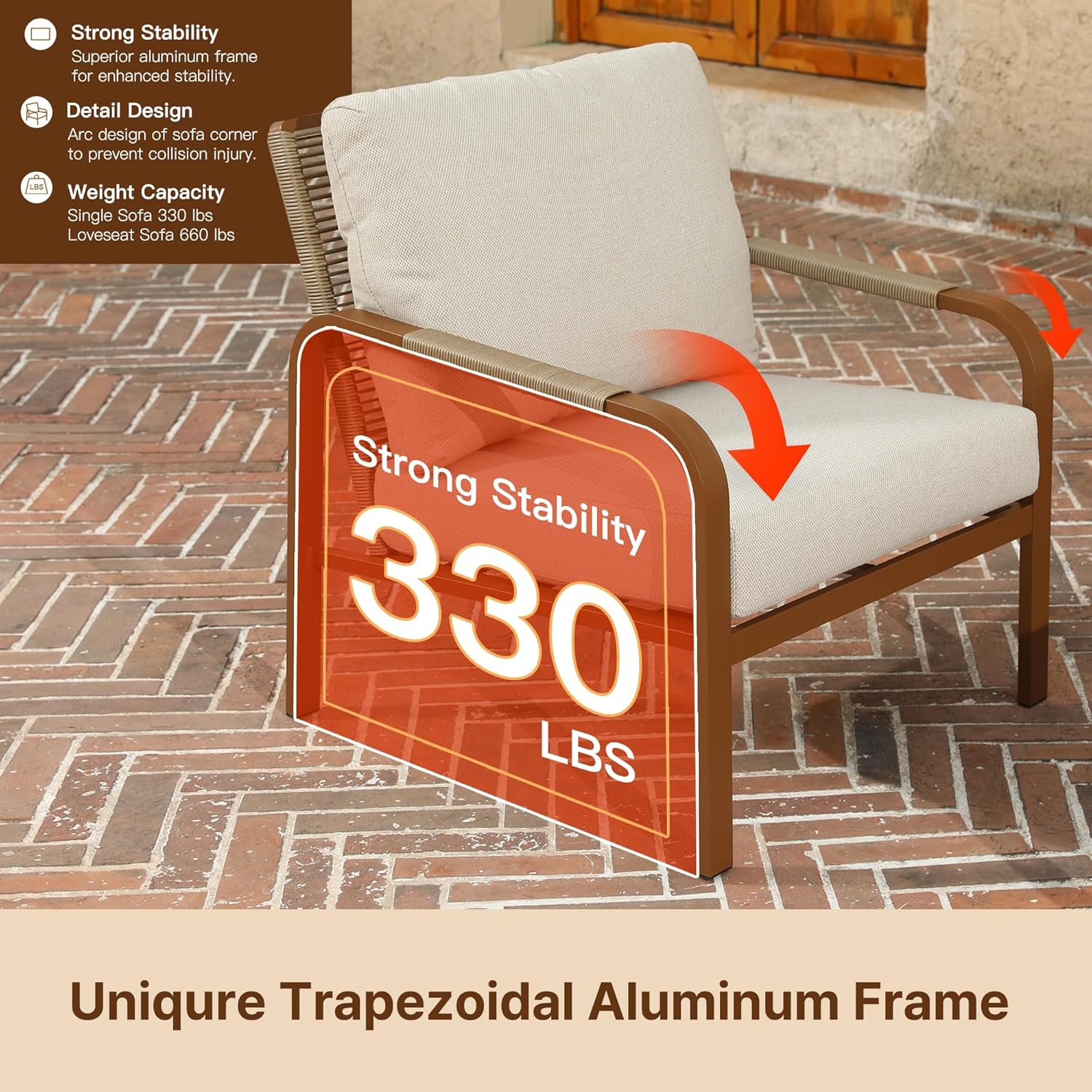 - Premium Durable Materials This patio bistro set features a rust-resistant powder-coated aluminum frame and all-weather PE rattan. It withstands sun, rain, and temperature changes, ensuring year-round durability. Each chair supports 330 lbs, and the coffee table holds 220 lbs. The rattan adds breathable texture, combining strength with modern style for reliable outdoor use.​
