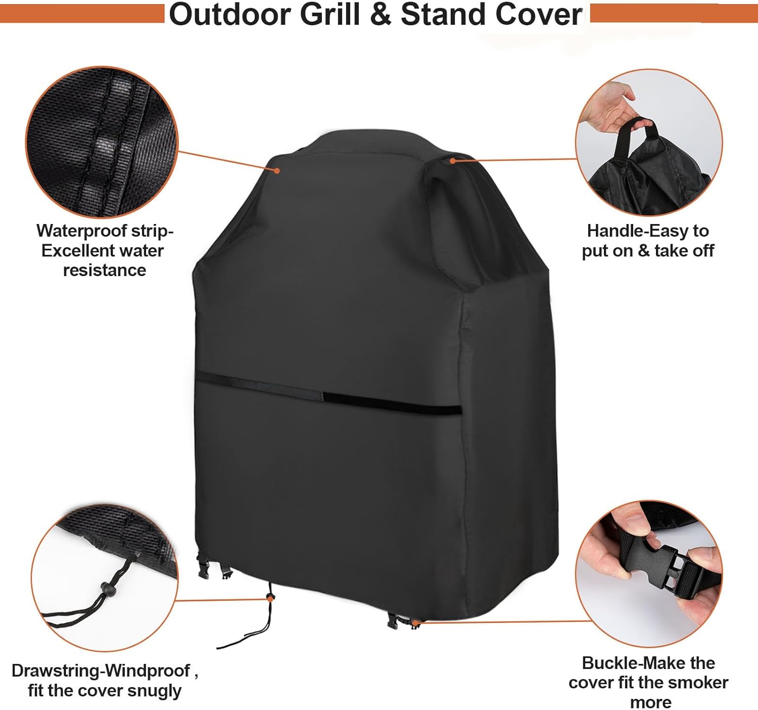 - Windproof: The bottom of the gas grill covers has drawstring to prevent it from blown away by strong winds. The hem are also provided plastic buckle keep the grill cover more secure and fit the grill. The grill could be moved freely with cover on