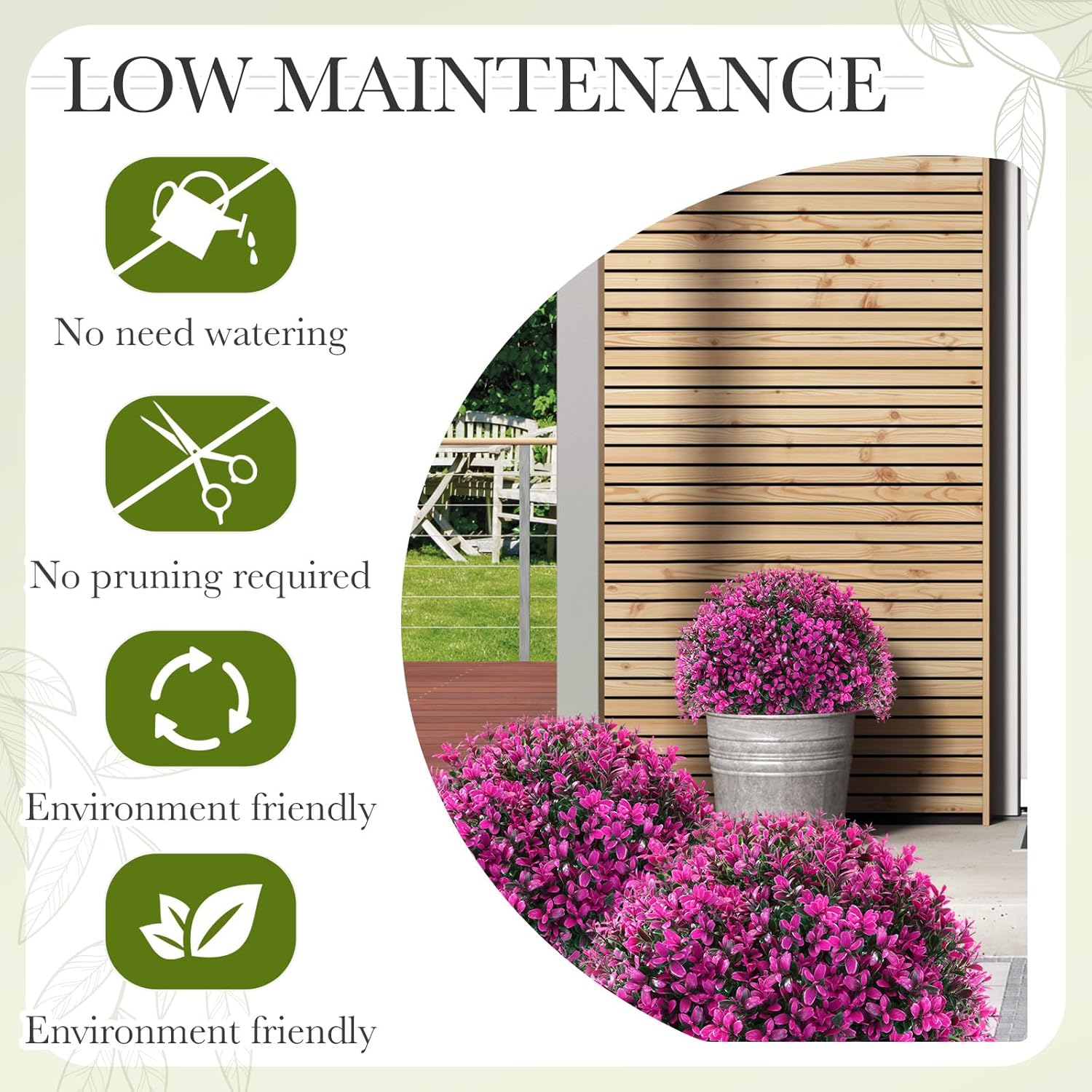 - Low Maintenance: our outdoor artificial shrubs do not need watering or pruning; No matter how the seasons change, they remain green and full of vitality all year round; Just put them anywhere you want to add a sense of decoration, and keep them beautiful green all year round