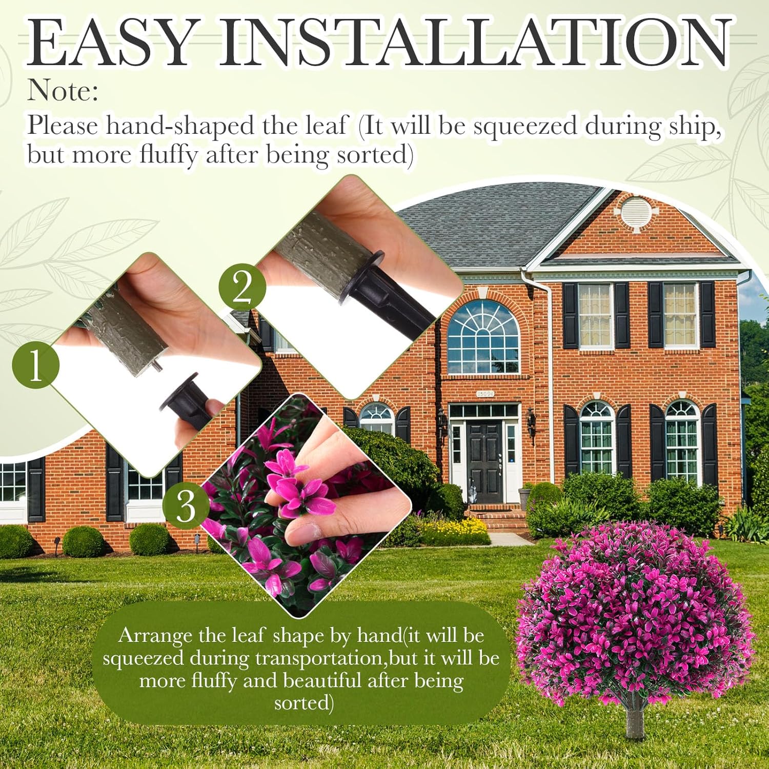 - Easy Installation: after assembly, you may need to manually adjust the leaves to achieve the desired shape; The design of the ground spike allows you to easily insert it into soil, grass or flowerpot without additional tools, making the installation simple and the placement flexible; If any leaves fall off during unpacking, just reattach them to the branches effortlessly