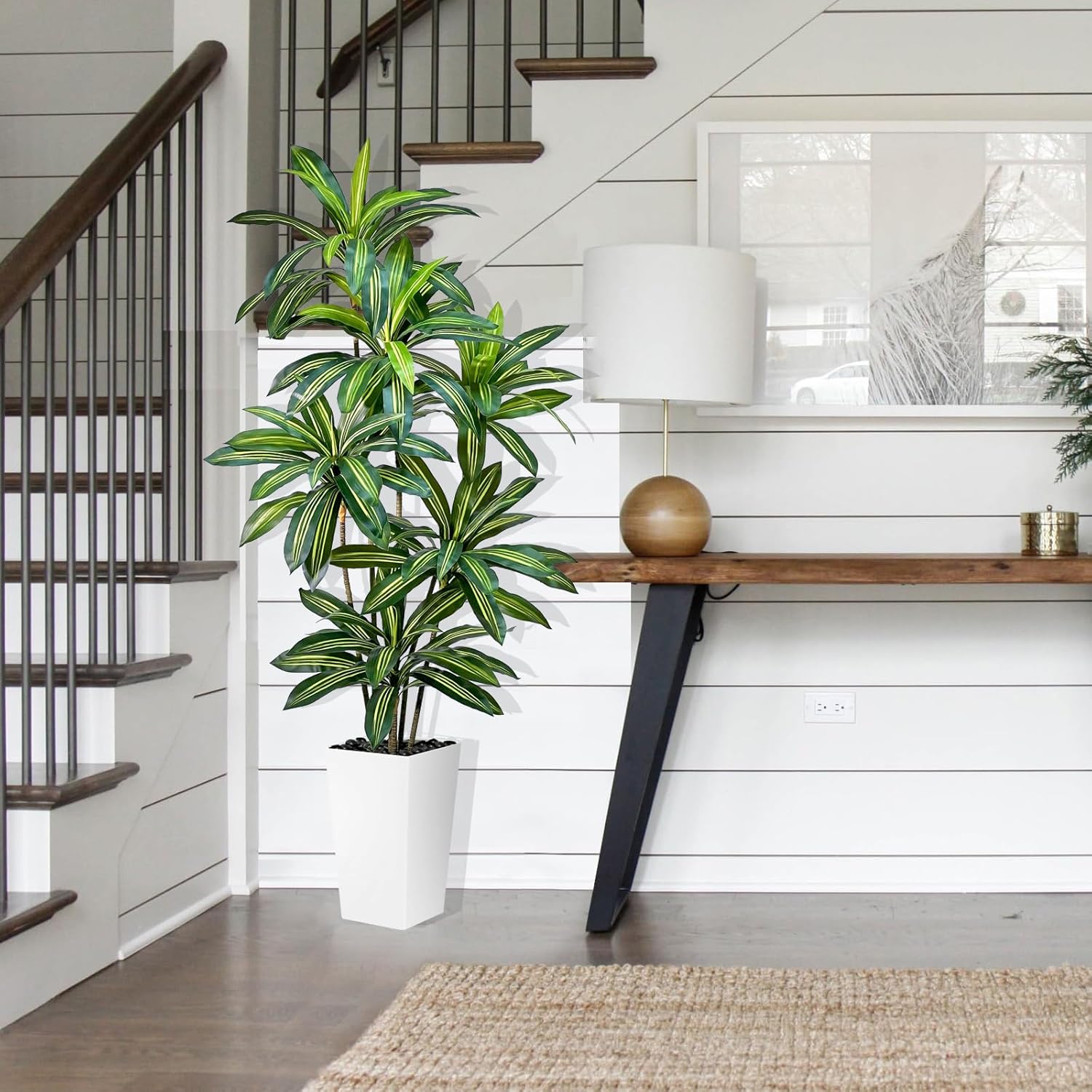 - 🌿Ultra-Realistic Design: Expertly crafted with premium silk leaves, flexible wire stems, and durable plastic components, this artificial Dracaena tree mimics the natural texture and movement of a real Dracaena tree. The hand-assembled details and multi-tonal coloring create lifelike depth, making it indistinguishable from a live plant at a glance.