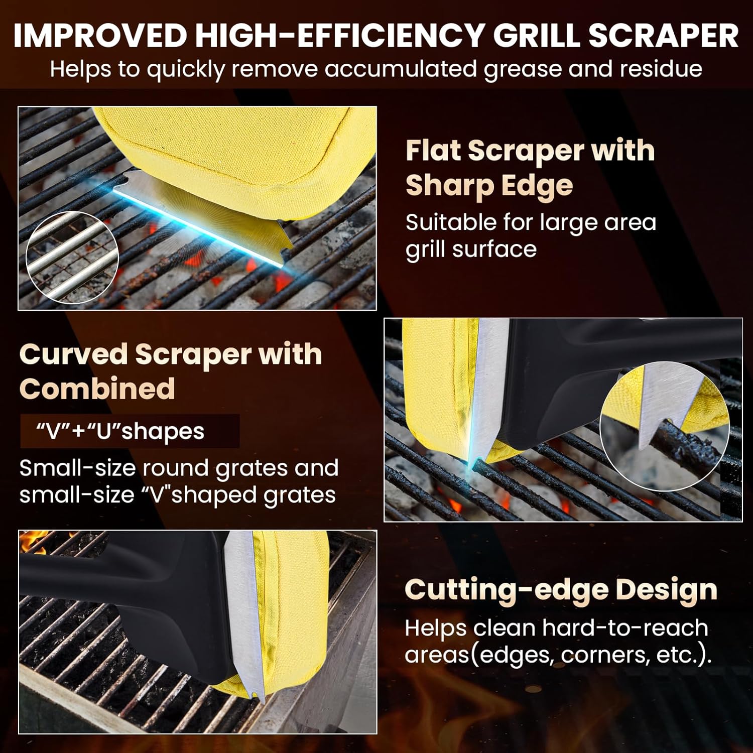 - 2. 【Professional Scraper & Heat-Resistant Brush】Built to Last Integrated stainless steel grill scraper for outdoor grill detaches for heavy-duty scraping. Paired with a 450°C-tolerant steel grill brush head, this barbecue grill brush doubles the lifespan of ordinary brushes.