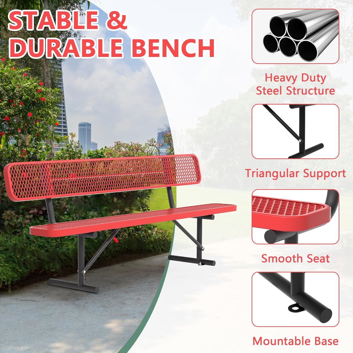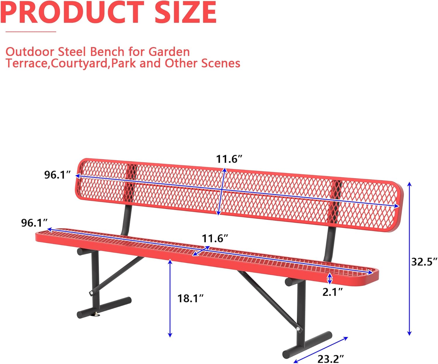 8FT Park Bench for Outside, Heavy-Duty Garden Bench W/ Back, Red Outdoor Metal Bench for Sitting Area, Commercial Bench for School Patio Porch Backyard Sports Church Locker Room Shopping Centers