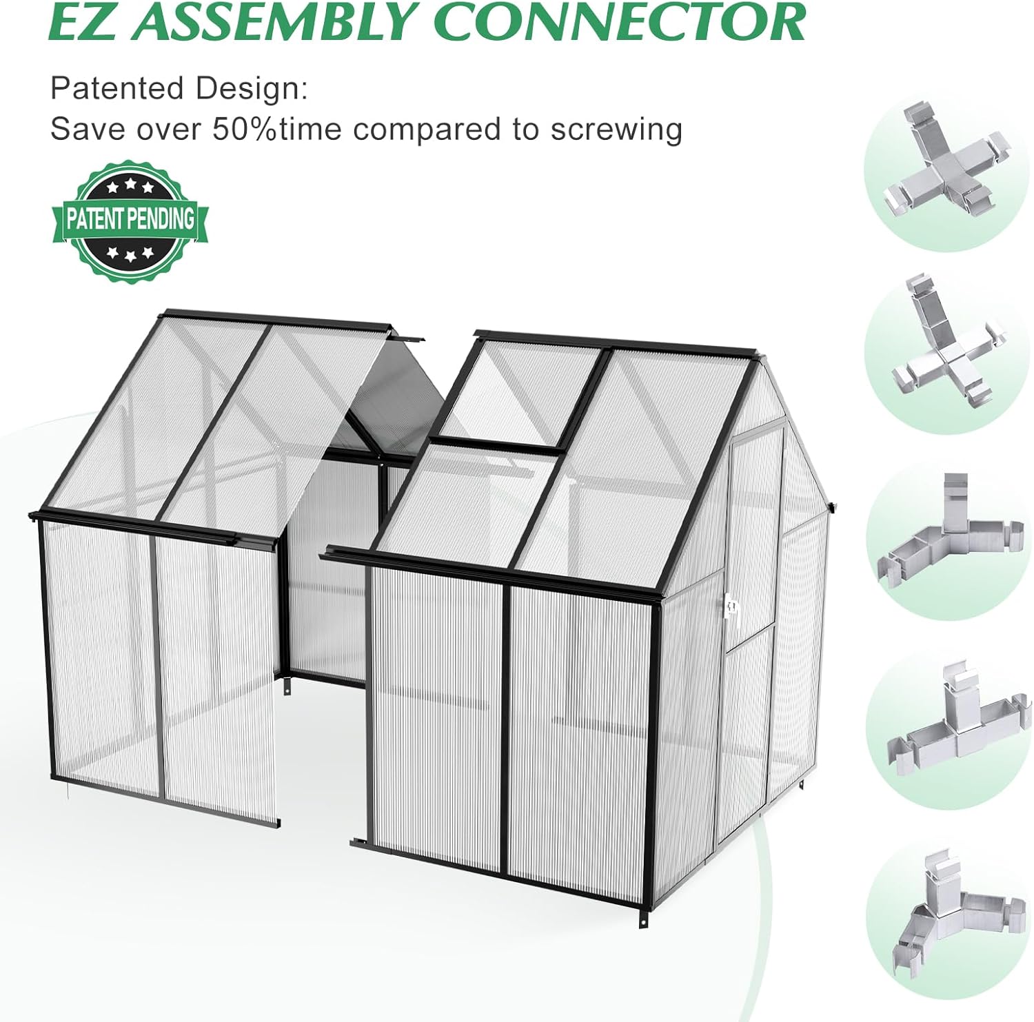 6'x8' Snap-Together Greenhouse - Easy 3-Way Connectors, Heavy-Duty Aluminum Frame, Wind/Snow Resistant for Gardening/Urban Farming, Includes Sliding Door and Ventilation Windows