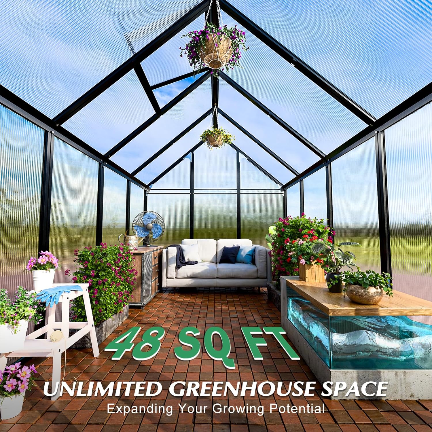 - Professional-Grade Polycarbonate: 4mm 800G multi-wall panels block 99% sunlight while maintaining 90% light transmission - 3X more durable than standard PVC greenhouses