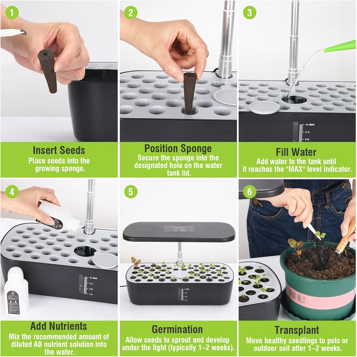 - š±52-Pod High Capacity Indoor Hydroponic Garden Kit: Featuring an ultra-large 52-pod design, this hydroponic growing system lets you grow a variety of herbs, vegetables, and flowers all year round. Perfect for families, schools, or hobby gardeners looking for efficient and space-saving planting indoors.