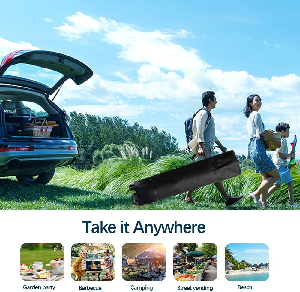 - 【All-In-One Wheeled Carry Bag】Pack once, roll anywhere. Comes with 4 sandbags, 8 stakes, and 4 ropes—everything stored neatly in a rugged wheeled bag with reinforced corners and 360° handles. Perfect for one-handed transport to campsites, fairs, or tailgate setups.