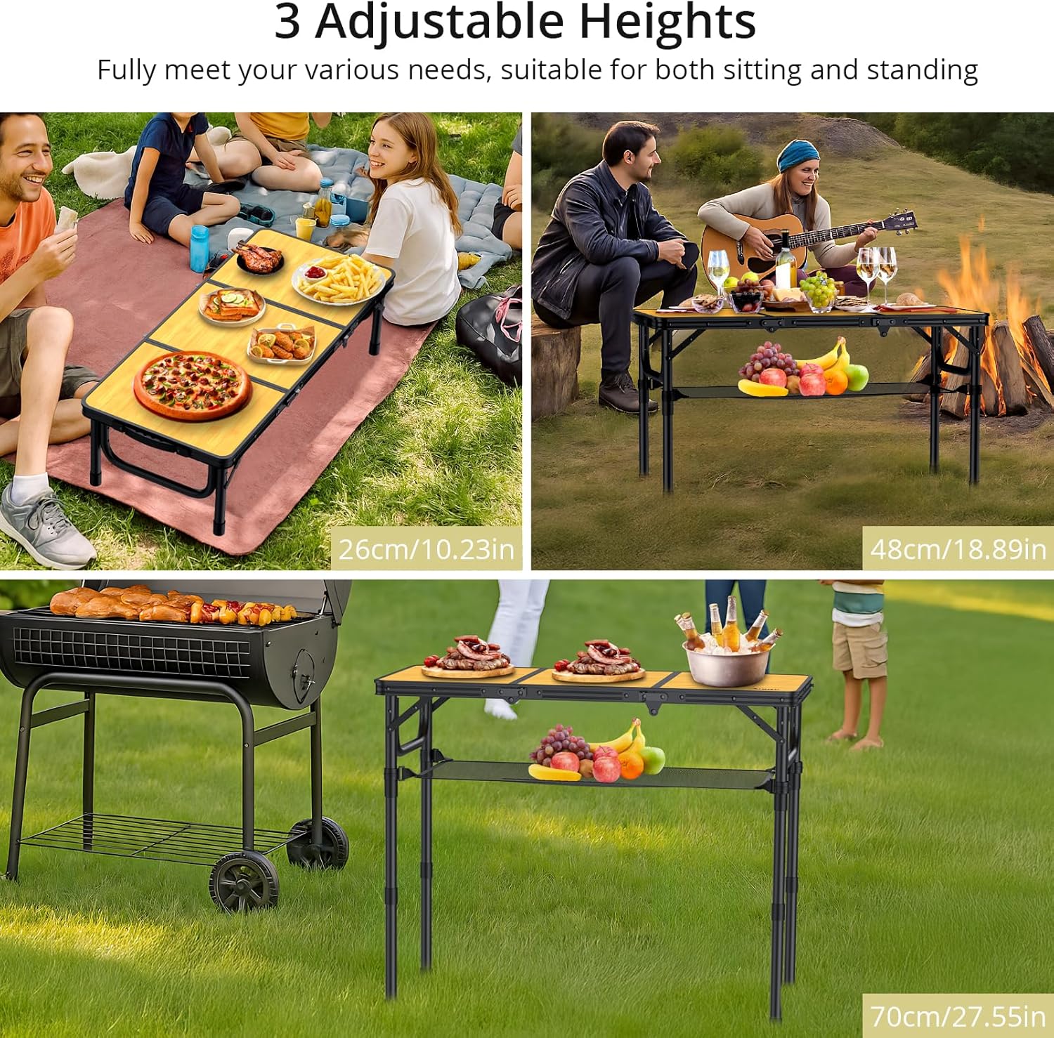 3ft Camping Table Foldable with Storage Net and Bag, 3 Adjustable Heights High 27.5" Aluminum Camping Table, Portable, for Outdoor Indoor Backyard BBQ Cooking Party Picnic Beach, Yellow