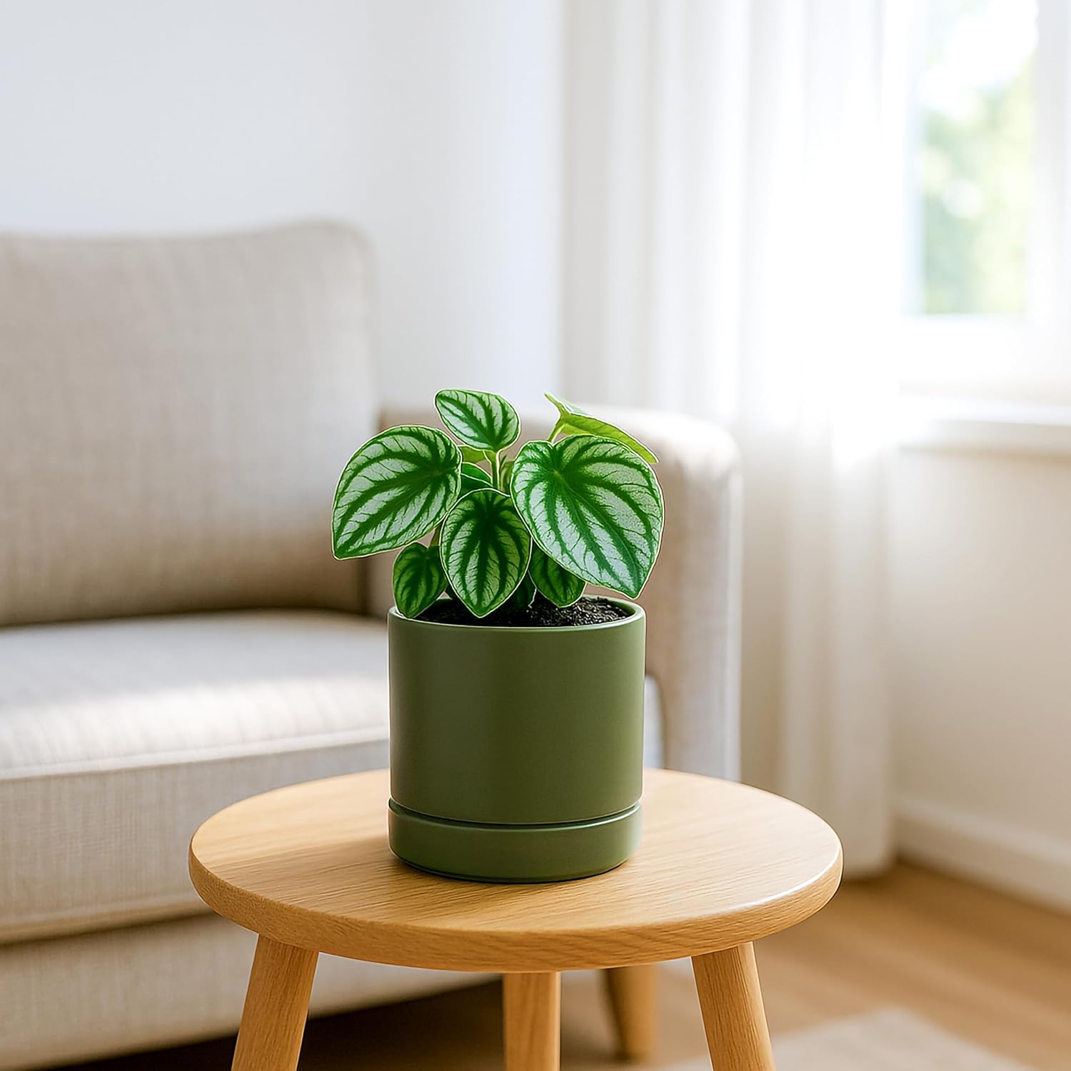 D'vine Dev Set of 2 Plants Pots, 4.7 Inch Ceramic Planter Pot for Plants with Drainage Hole and Saucer, Olive, 94-V-B-J