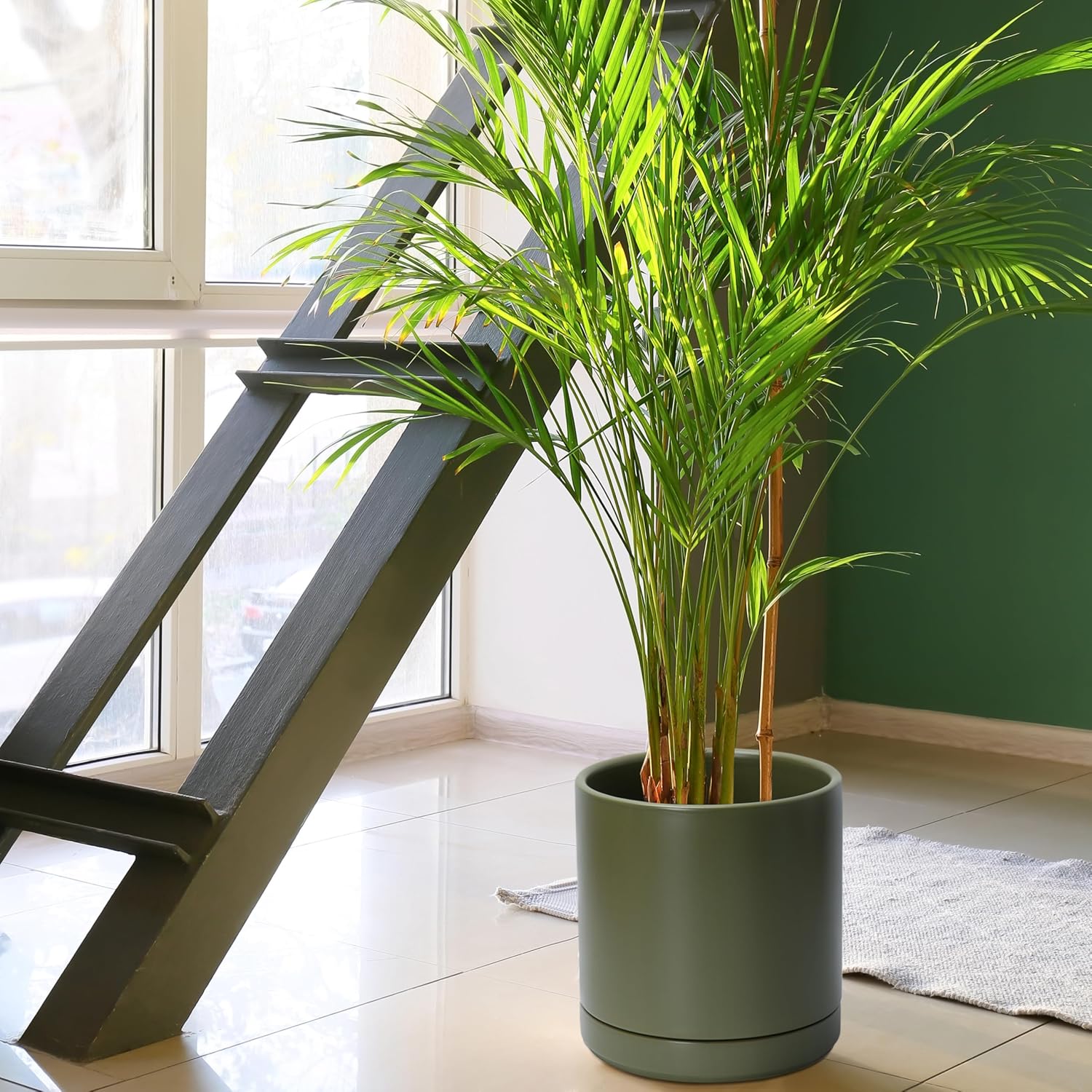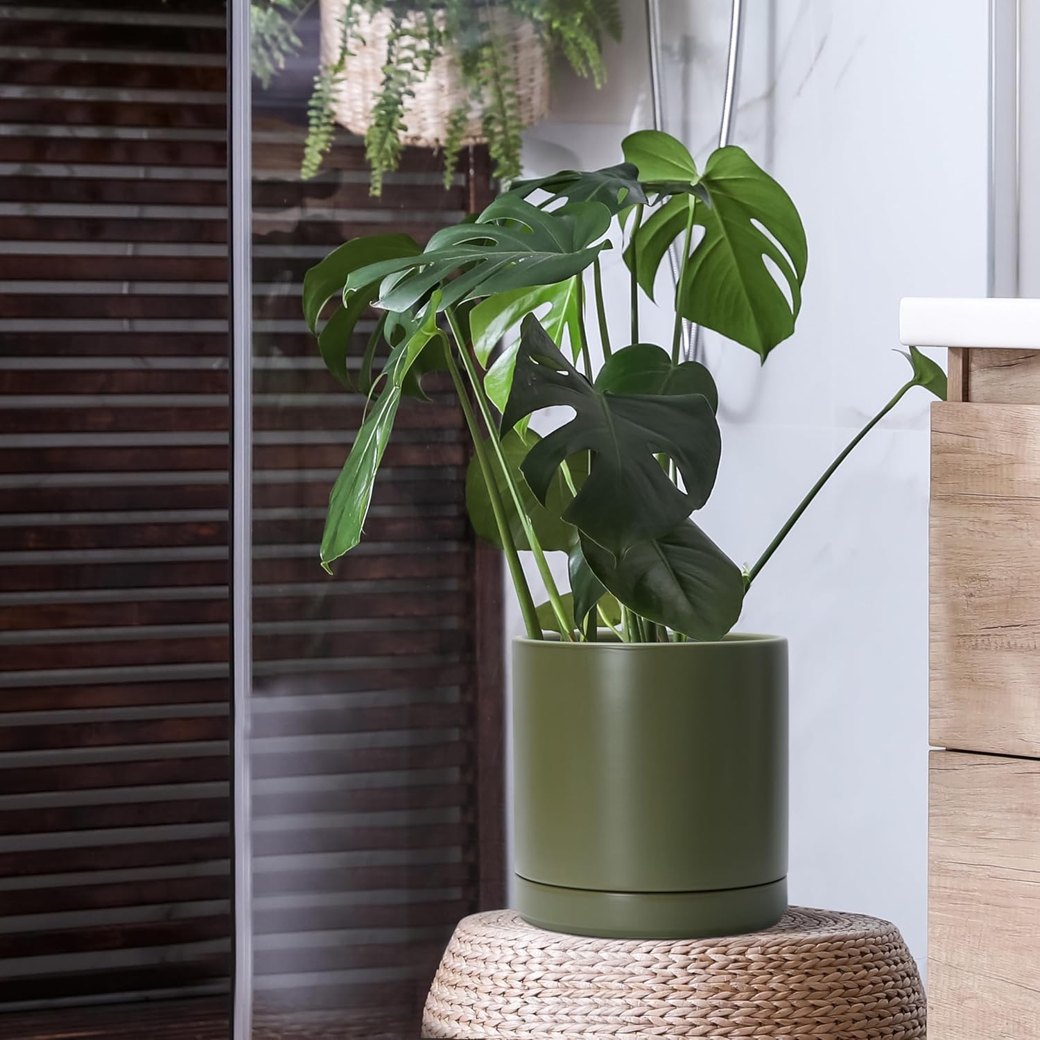 D'vine Dev Set of 2 Plants Pots, 10 Inch Ceramic Planter Pot for Plants with Drainage Hole and Saucer, Olive, 94-V-E-J