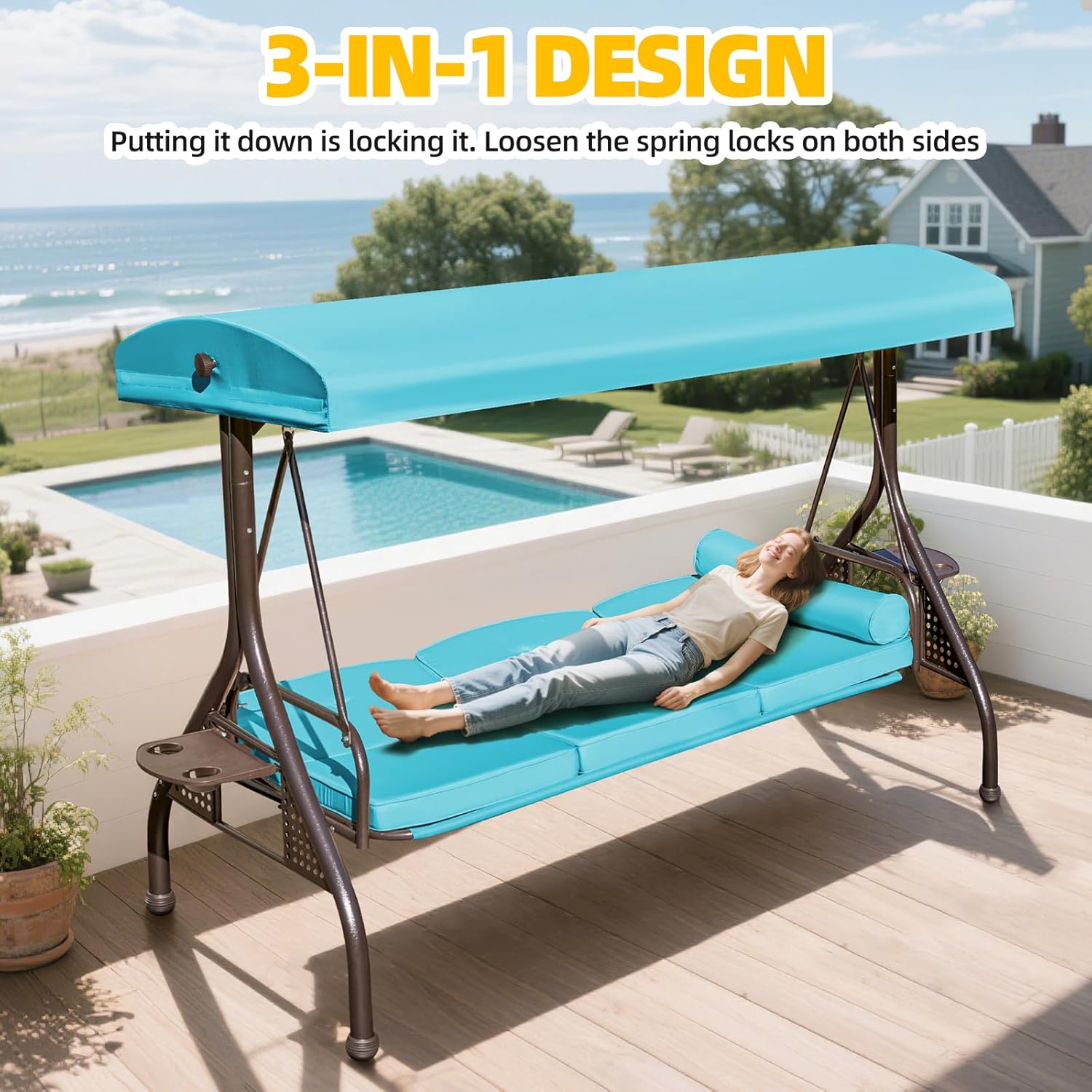 3-seat Patio Swing with Canopy,Convertible Outdoor Swing Bed with Thick Cushions, Pillows & Cup Holders, 3-Seat Outdoor Swings Chair for Backyard, Garden, Deck(Lake Blue)