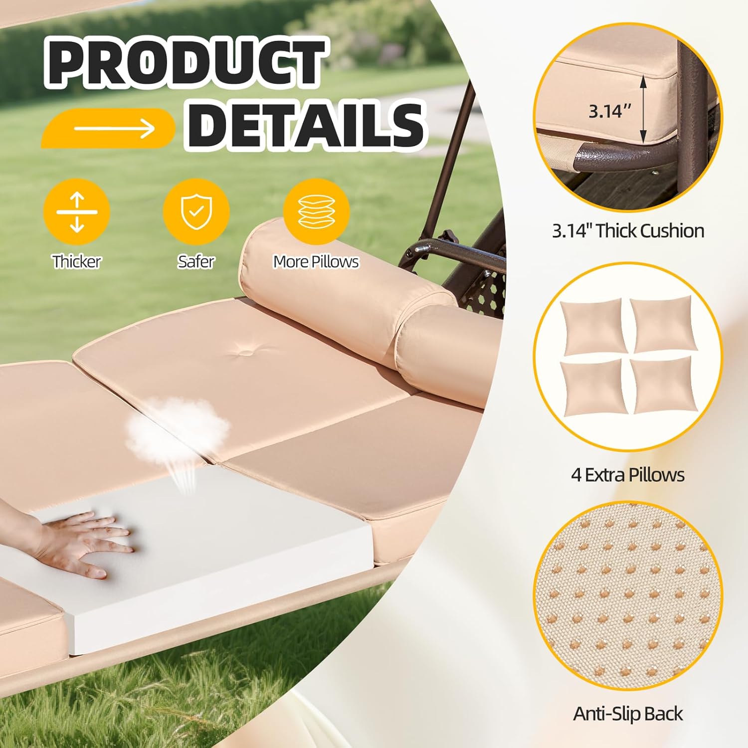 - Anti-Slip Cushion Design for Extra Comfor: Listening to customer, we've upgraded our outdoor swing cushions! The seat cushion now features a bottom layer of rubber anti-slip dots to reduce unwanted sliding and keep your cushion securely in place — even when the swing moves. The thick 3.6-inch cushion, filled with high-resilience sponge, and two headrest pillows provide exceptional comfort and neck support