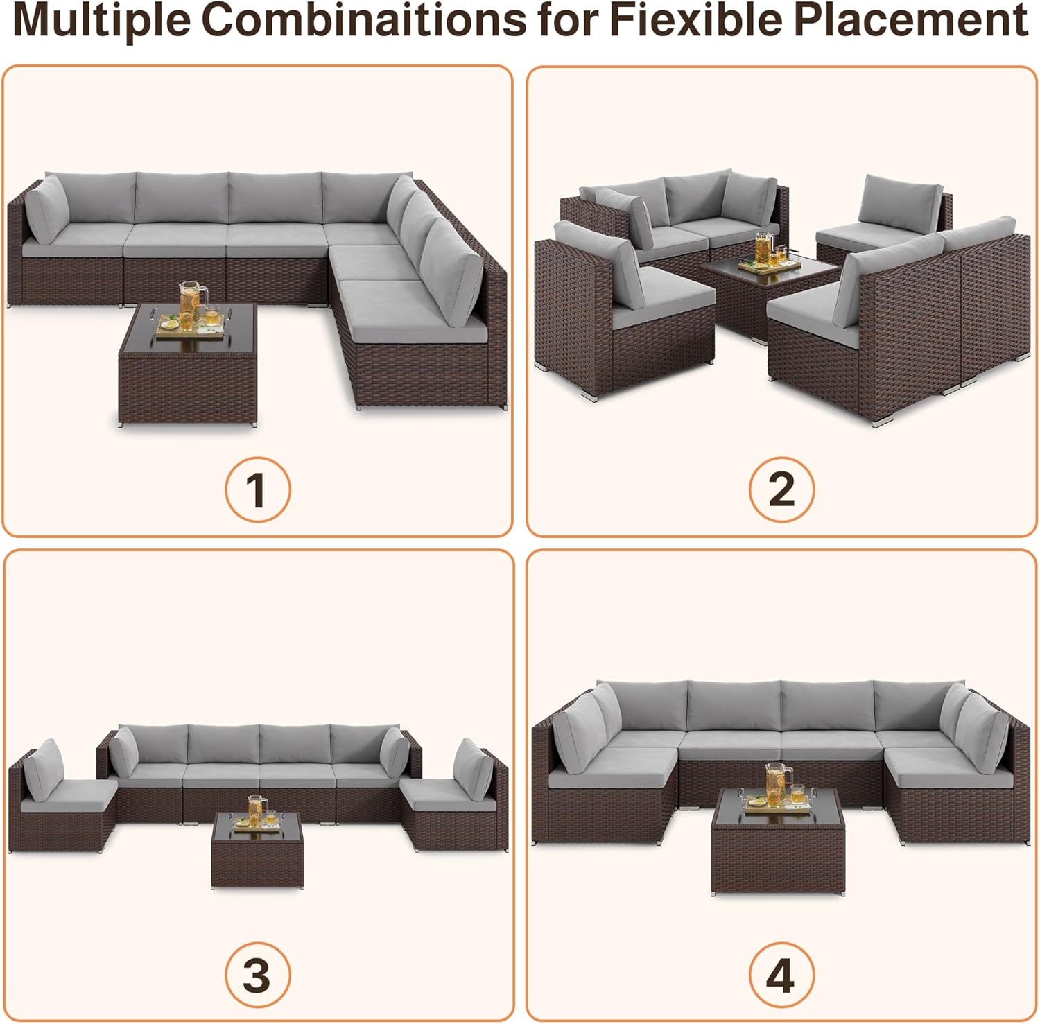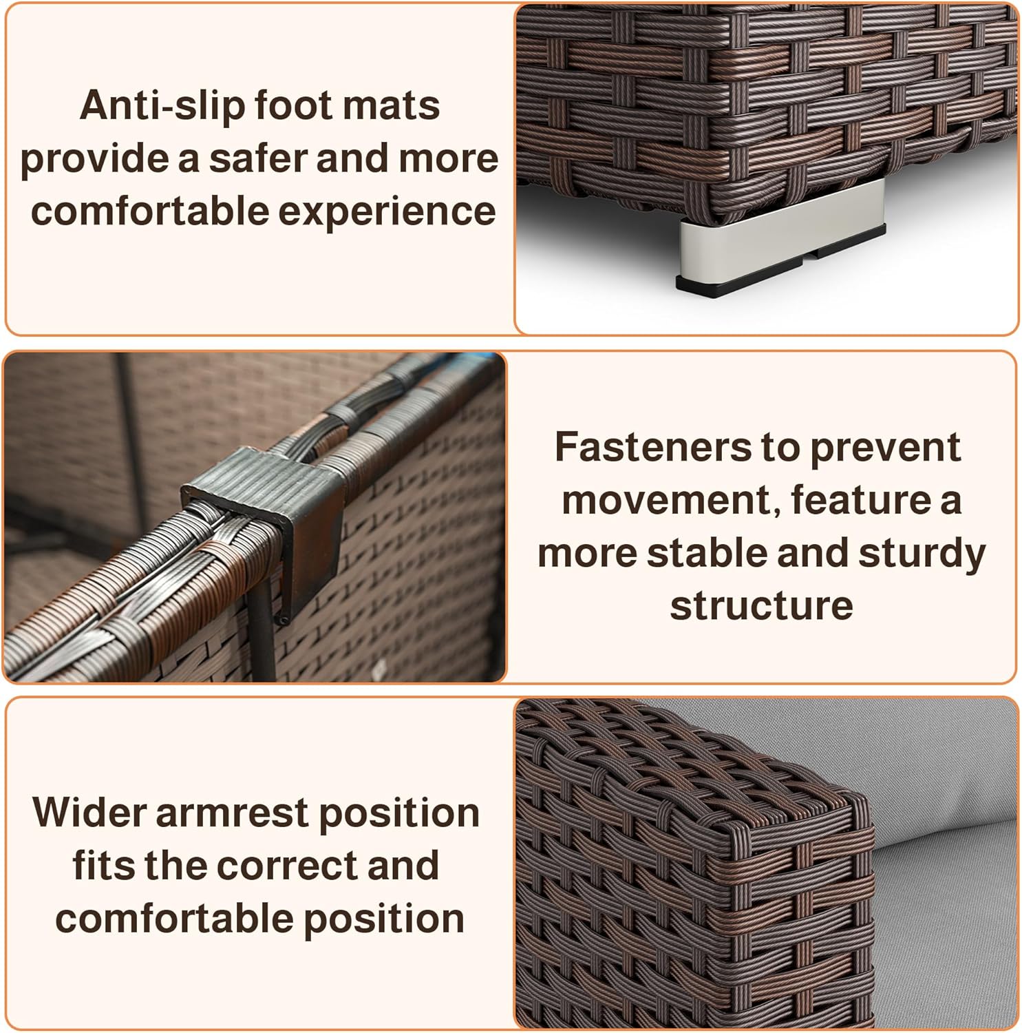 - Modular Design for Flexible Setup: This outdoor sectional features a modular design that allows you to rearrange the pieces to fit your space—whether it's a patio, garden, balcony, or backyard. Its sleek style complements most décor and works well in both outdoor and indoor environments.