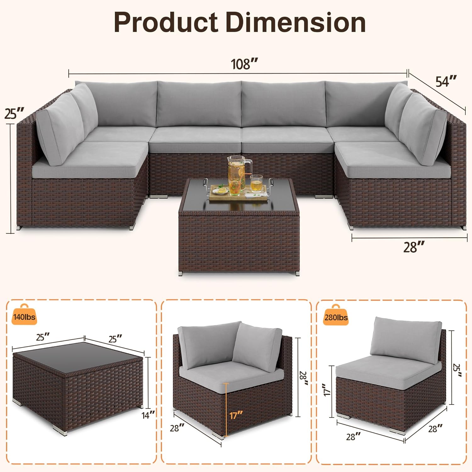 Ahomly 7-Piece Patio Furniture Set, Outdoor Sectional Couch with Water-Resistant Cushions & Coffee Table, PE Rattan Outdoor Patio Sofa Set for Backyard, Deck, Garden, or Porch, Grey