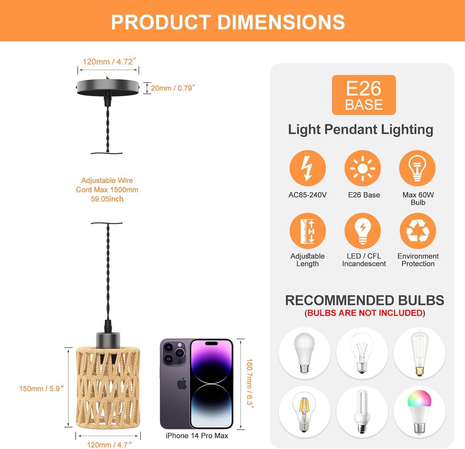 - 📏 【Adjustable Height & Versatile Placement】The rattan light fixture has a 4.7-inch diameter shade with an adjustable cord (9.8"–59"),fitting both flat and sloped ceilings.Perfect for hallways,entryways,living rooms,bedrooms,porches,kitchens,and dining areas,this wicker pendant light becomes a stylish focal point in any room.
