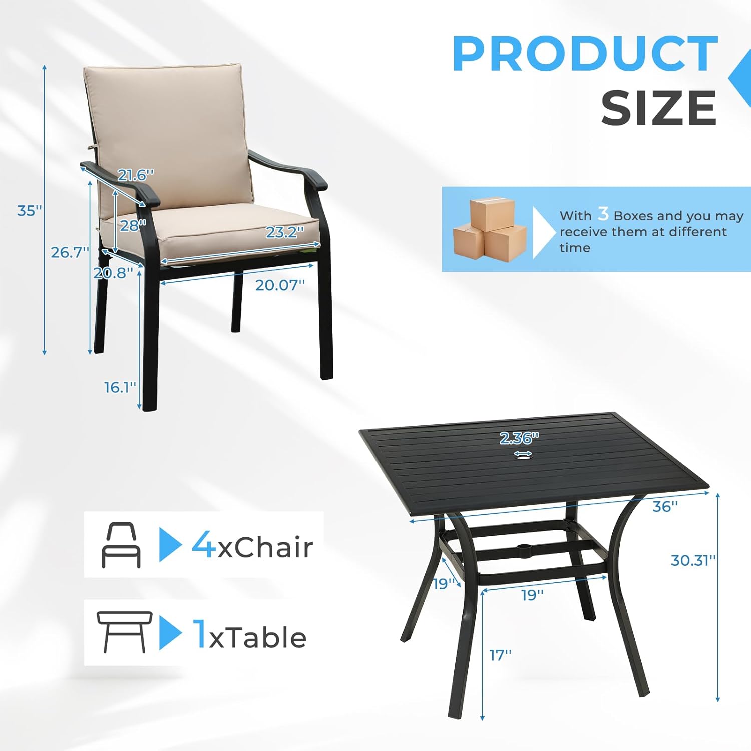 - Umbrella Hole for Shade: There is a 2.36” umbrella hole in the middle of the patio table, which can fit most outdoor umbrellas. It can block strong direct sunlight very well, and is very suitable for outdoor summer cooling (Note: Umbrella is not included)