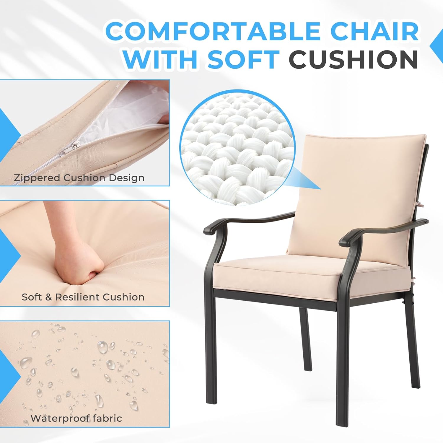- Comfy Patio Chairs: Our outdoor armchairs feature a curved backrest and armrests, providing ergonomic support. The metal dining chairs provide excellent comfort for long hours of relaxation, perfect for your patio chairs and outdoor armchairs with cushions