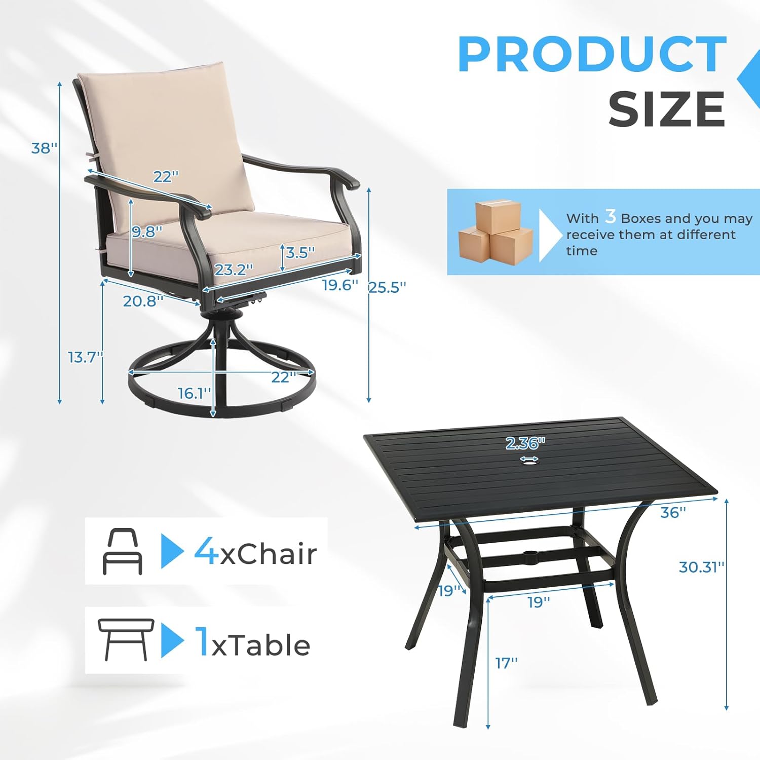 - 5-Piece Patio Dining Set: Our patio furniture set includes 4 swivel chairs and 1 square outdoor dining table. This outdoor dining set is finished in a black powder coated surface and features soft vertical curves that match the modern clean aesthetic. The khaki cushions add a splash of colour to the set for understated sophistication.